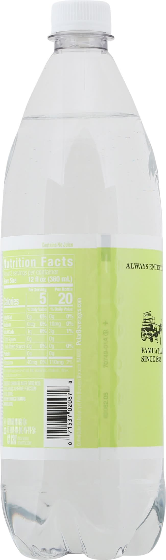 Tonic Water with Lime, Zero-Sugar, Diet • Brand: Polar • Flavor: Lime • kosher, • Polar Beverages, Worcester, MA, 01610 • Packaging: Reusable