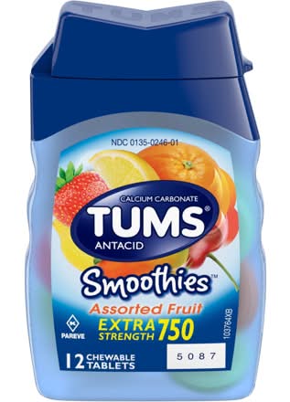 TUMS Smoothies Extra Strength Antacid Chewable Tablets Assorted Fruit 12 ct 750 mg Bottle