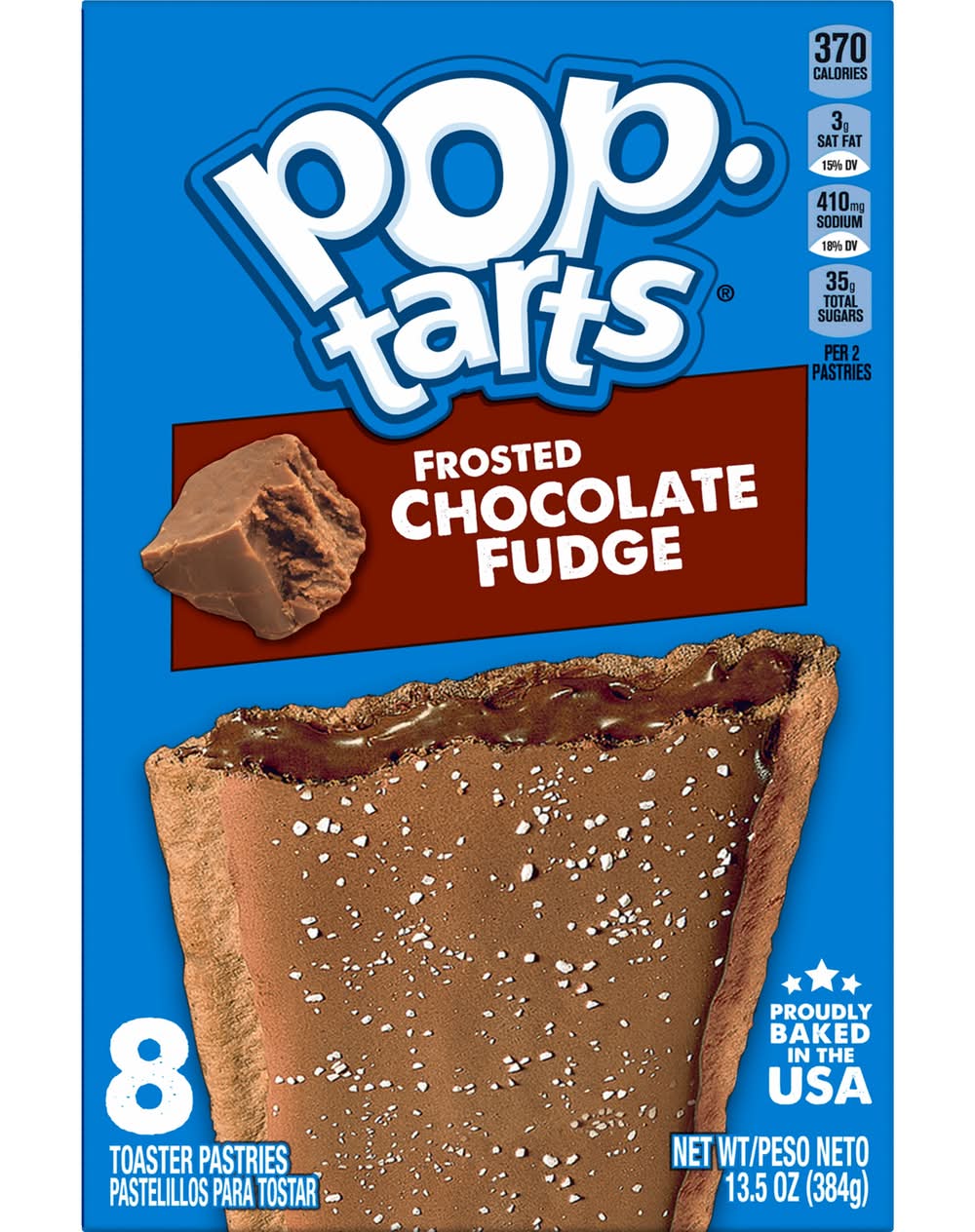 Pop-Tarts toaster pastries are the perfect sweet treat at breakfast, for lunch snack time, or dessert. Featuring a sweet chocolate fudge-flavored filling and crunchy sprinkles on a soft pastry crust, this ready to eat treat is perfect for snack time for kids and adults on the go. Pack Pop-Tarts Frosted Chocolate Fudge in lunchboxes or backpacks when it's time for school snacking, or stock the office pantry with this individually wrapped grab and go adult snack time choice. Pop them in the toaster and pair with milk, create your own ice cream sandwiches, or incorporate into your favorite dessert recipe for a sweet treat. These irresistible snack time options for kids and adults provide a good source of three B vitamins. Stock your pantry with these shelf stable snack alternatives and enjoy ready to eat treats anytime. A flavor for everyone, including beloved classics like Frosted Strawberry or Frosted Cherry, or our more indulgent flavors, Frosted Cookies and Creme or Frosted Brown Sugar Cinnamon. • Kellogg Sales Co., Battle Creek,MI,49016,USA • Packaging: Reusable