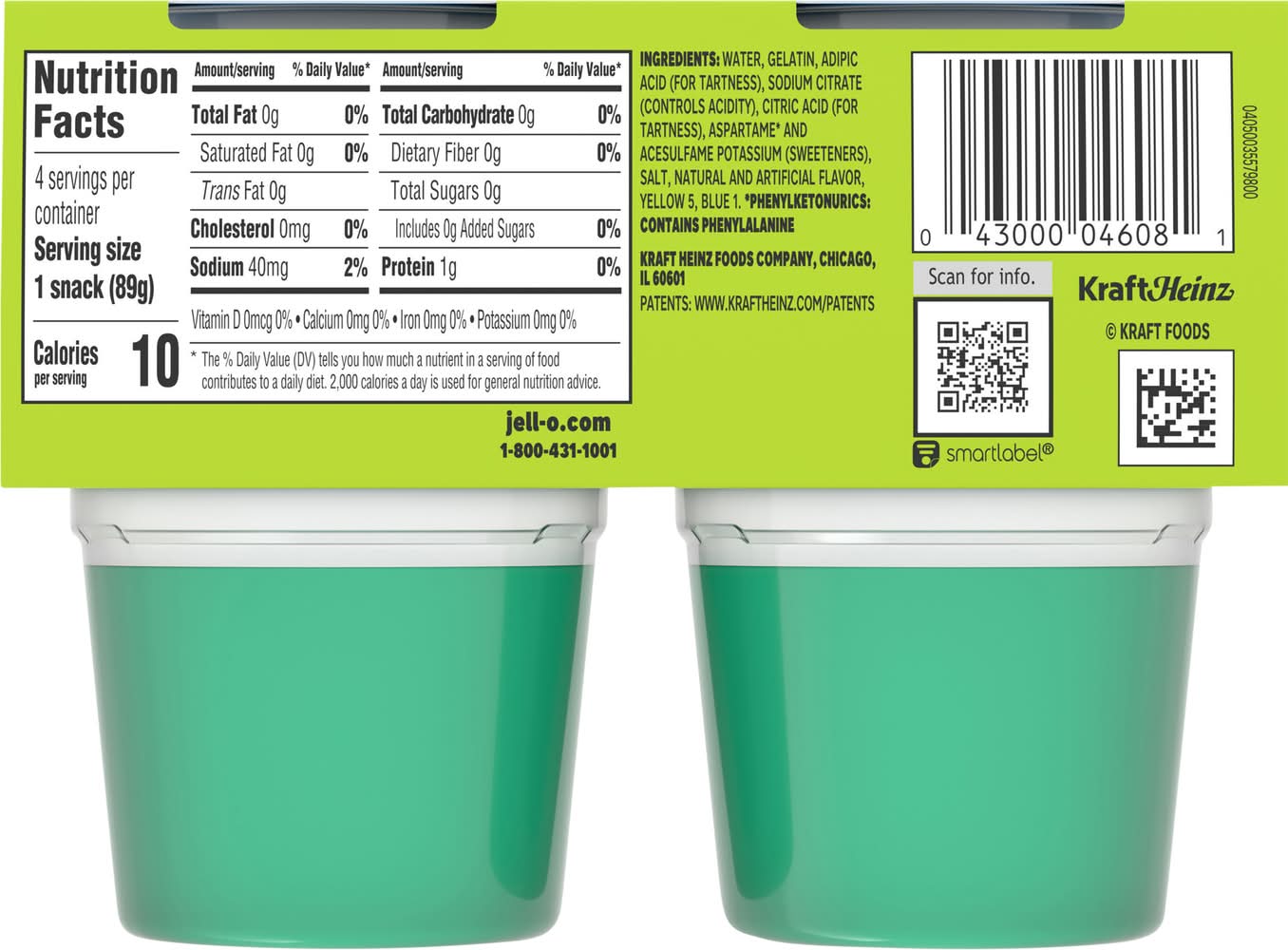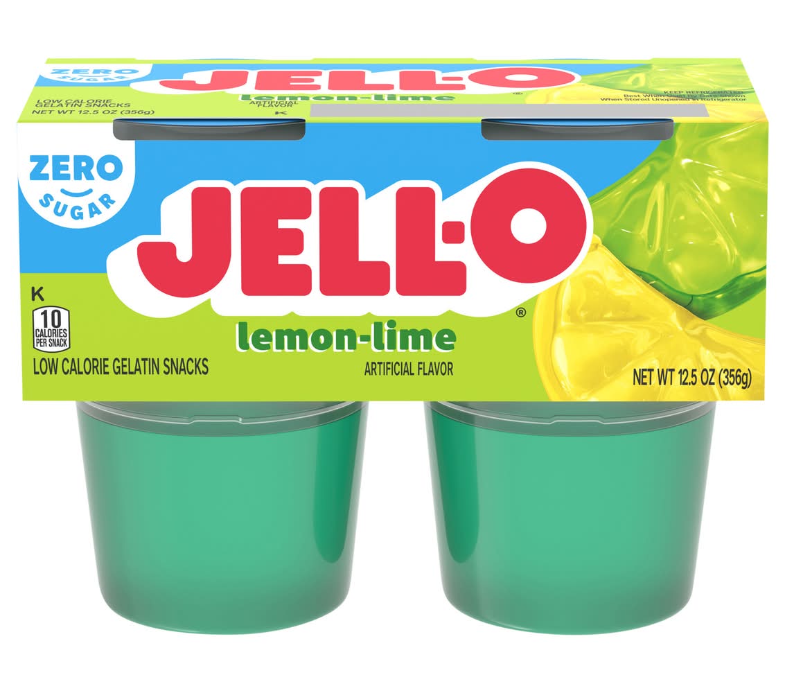 Snack happy. Jell-O Zero Sugar Lemon Lime Artificially Flavored Gelatin Cups deliver the great taste of Jell-O Gelatin in a low-calorie choice. Our delicious on-the-go gelatin comes in individual snack cups, perfect for putting into a lunchbox or snacking at home. Zero Sugar artificially flavored lemon lime gelatin is fat-free and contains 10 calories per serving. Great for those keeping Kosher. Each 12.5-ounce sleeve contains four Jell-O Zero Sugar Lemon Lime Artificially Flavored Gelatin Cups for quick and easy snacking. • Flavor: Lemon-lime • Kraft Heinz Foods Company, Chicago, IL, 60601