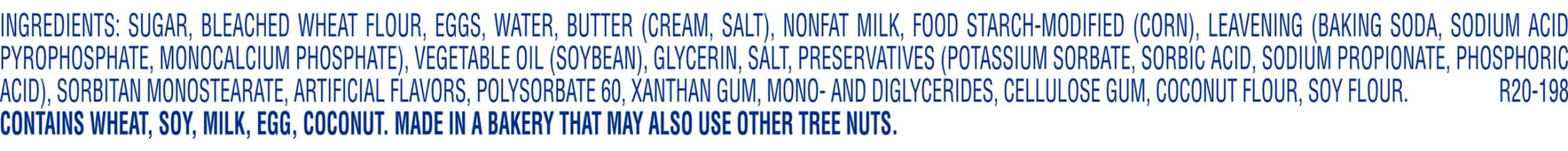 Ingredients: Sugar, Bleached Wheat Flour, Eggs, Water, Butter (Cream, Salt), Nonfat Milk, Food Starch-Modified (Corn), Leavening (Baking Soda, Sodium Acid Pyrophosphate, Monocalcium Phosphate), Vegetable Oil (Soybean), Glycerin, Salt, Preservatives (Potassium Sorbate, Sorbic Acid, Sodium Propionate, Phosphoric Acid), Sorbitan Monostearate, Artificial Flavors, Polysorbate 60, Xanthan Gum, Mono- and Diglycerides, Cellulose Gum, Coconut Flour, Soy Flour Contains: Wheat, Soybeans, Milk, Eggs, Tree Nuts, Coconuts, Corn, Tree Nuts