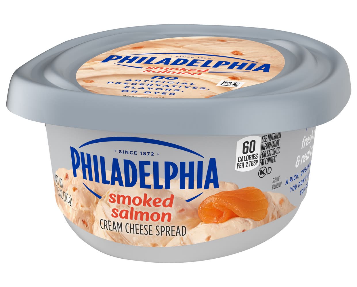 Made with fresh milk, real cream and smoked salmon for an extra creamy, multi-dimensional taste you can add to any meal. At Philly, we leave out the artificial preservatives, flavors and dyes to ensure a rich, quality flavor. Our smoked salmon cream cheese spread is easy to spread, making it the perfect choice for adding to your morning bagel or elevating a breakfast sandwich. • Flavor: Smoked salmon • Kraft heinz foods company, Chicago, IL, 60601, 800-634-1984 • Packaging: Reusable