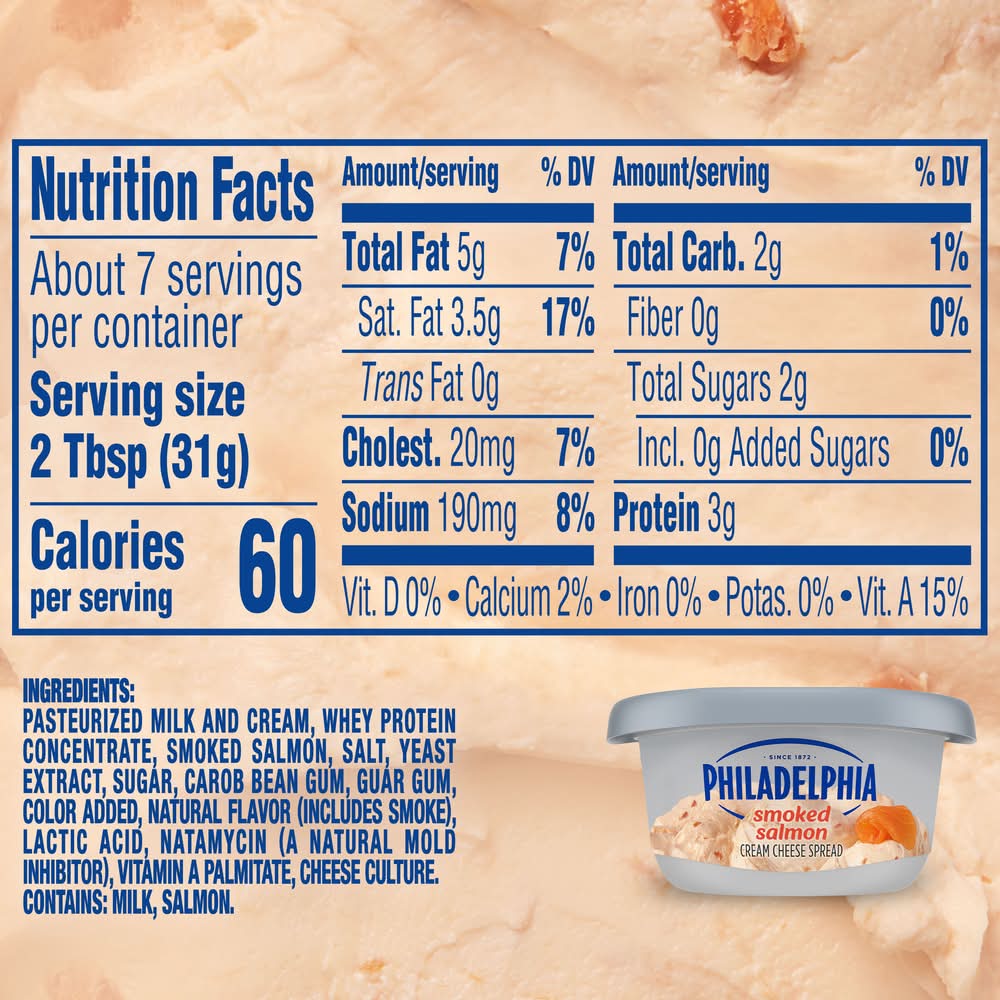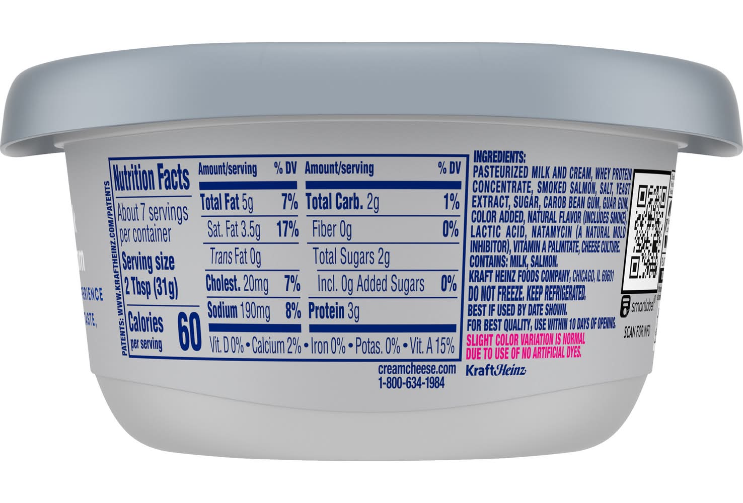 Ingredients: PASTEURIZED MILK AND CREAM, WHEY PROTEIN CONCENTRATE, SMOKED SALMON, SALT, YEAST EXTRACT, SUGAR, CAROB BEAN GUM, GUAR GUM, COLOR ADDED, NATURAL FLAVOR (INCLUDES SMOKE), LACTIC ACID, NATAMYCIN (A NATURAL MOLD INHIBITOR), VITAMIN A PALMITATE, CHEESE CULTURE. Contains: CONTAINS: MILK, SALMON.