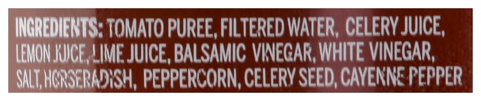 Ingredients: Tomato Puree, Filtered Water, Celery Juice, Lemon Juice, Lime Juice, Balsamic Vinegar, White Vinegar, Salt, Horseradish, Peppercorn, Celery Seed, Cayenne Pepper