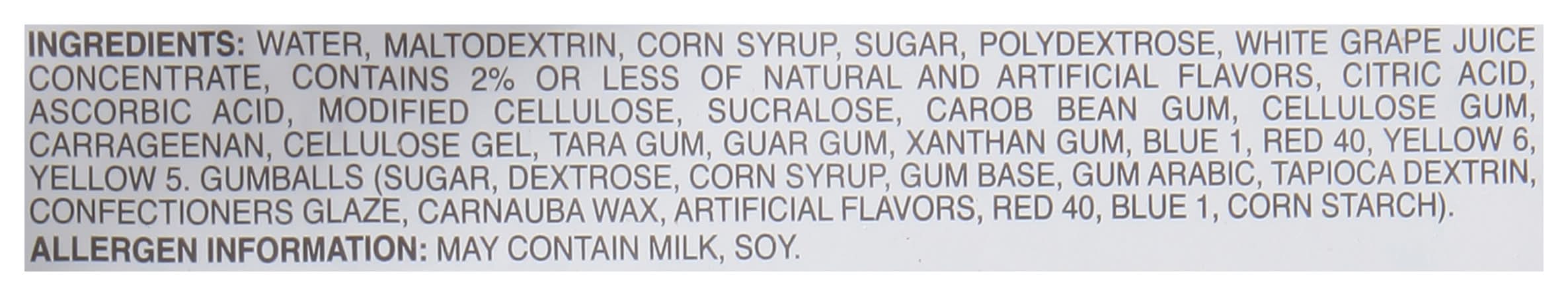 Ingredients: Water, Maltodextrin, Corn Syrup, Sugar, Polydextrose, White Grape Juice Concentrate, Contains 2% or Less of Natural and Artificial Flavors, Citric Acid, Ascorbic Acid, Modified Cellulose, Sucralose, Carob Bean Gum, Cellulose Gum, Carrageenan, Cellulose Gel, Tara Gum, Guar Gum, Xanthan Gum, Blue 1, Red 40, Yellow 6, Yellow 5, Gumballs (Sugar Dextrose Corn Syrup Gum Base Gum Arabic Tapioca Dextrin Confectioners Glaze Carnauba Wax Artificial Flavors Red 40 Blue 1 Corn Starch) Contains: May contain Milk, Soy.