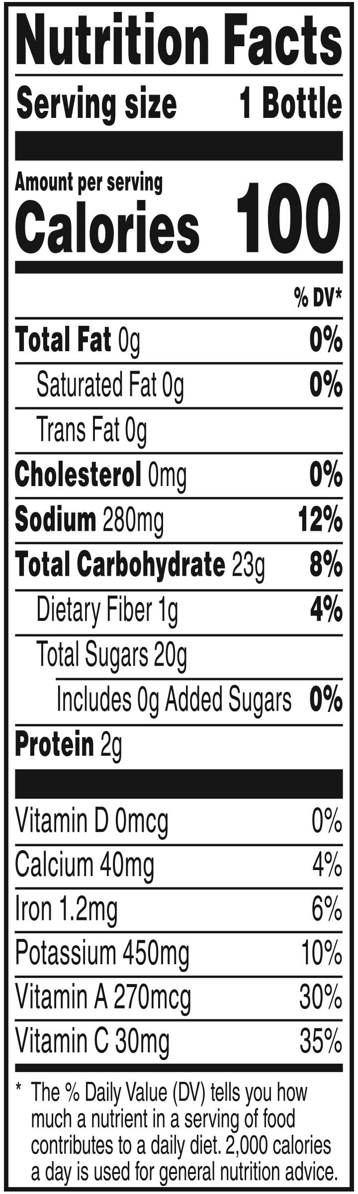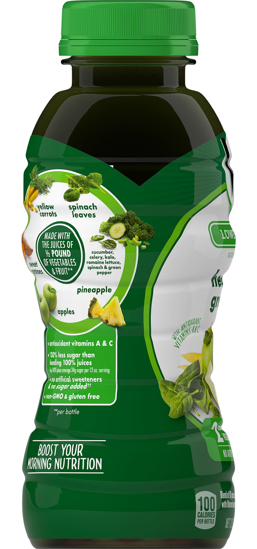 Ingredients: INGREDIENTS: VEGETABLE JUICE (FILTERED WATER AND CONCENTRATED JUICES OF SWEET POTATOES, YELLOW CARROTS, SPINACH, CUCUMBER, CELERY, KALE, ROMAINE LETTUCE, GREEN PEPPER), FILTERED WATER, FRUIT JUICE (FILTERED WATER AND CONCENTRATED JUICES OF APPLES, PINEAPPLE), CITRIC ACID, NATURAL FLAVORING, DEHYDRATED SPINACH, SPINACH PUREE (SPINACH, WATER), VITAMIN C (ASCORBIC ACID), BETA CAROTENE, HUITO JUICE CONCENTRATE (FOR COLOR), WATERMELON JUICE CONCENTRATE (FOR COLOR).