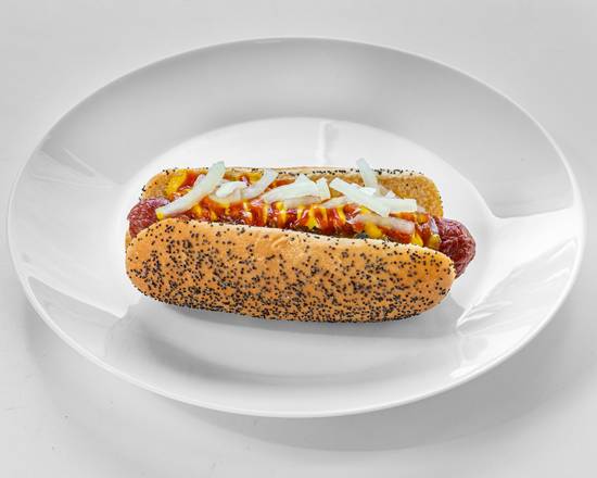 Our 1/4 lb Hot dog with Ketchup, mustard, onions, and relish.