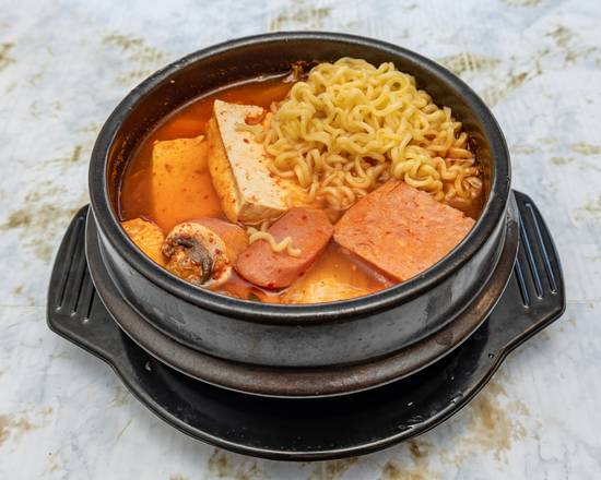 Spice beef stock soup with rice, Chinese cabbage, pork, sausage, ramen, tofu, ham, pepper, spring onion, sweet potato noodle with spice sauce.