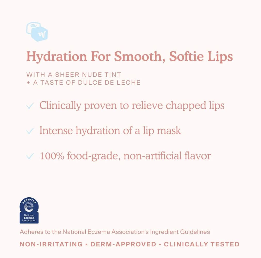 What it is: A clinically proven, non-sticky lip balm treatment that delivers the intense hydration of a lip mask with a sweet sheer tint using food-grade, non-artificial flavor that is safe for sensitive lips. Formulation Type: Lip Balm & Treatment Benefits: Hydrating Highlighted Ingredients: - Shea Butter: Boosts lip hydration and soothes skin.- Jojoba Oil: Locks in moisture to keep lips soft and supple.- Lysine: Prevents dryness and helps to smooth and soften lips. Ingredient Callouts: Free of parabens, phthalates, and contains less than one percent synthetic fragrance. It is also gluten-free, cruelty-free, and comes in recyclable packaging. What Else You Need to Know: This dermatologist-approved lip balm delivers instant comfort and long-lasting hydration for smooth, softie lips. It is designed for even the most sensitive, irritated lips, the cushiony formula helps relieve chapped skin. The sweet scent is fragrance-free to avoid drying lips out. The different flavors include watermelon kiwi, dulce de leche, ube vanilla, and blood orange vanilla. Clinical Results: Based on a third-party clinical test with 34 people, immediately after use:- 100% agree it relieves chapped lips- 100% agree it instantly comforts dry lips. After 2 weeks of use:- 100% agree lips feel softer after use- 100% agree formula delivers long-lasting hydration-100% agree product helps heal and repair dry, damaged lips Color: Dulce de leche