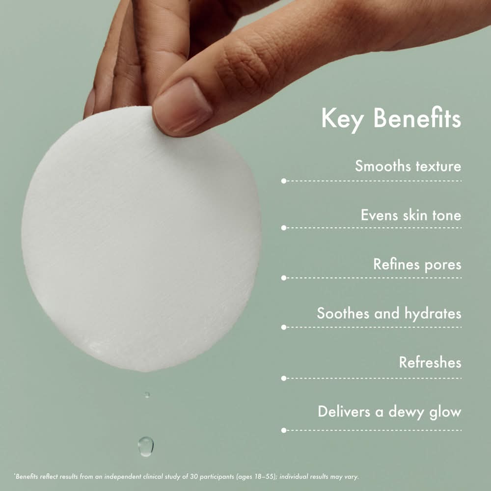 What it is: Formulated in Korea for daily use, these dual-sided pads smooth texture and even tone for brighter, more radiant looking skin. Skin Type: Normal, Dry, Combination, and Oily Skincare Concerns: Anti-Aging, Dryness, and Dullness Formulation: Wipes Ingredient Callouts: This product is vegan and cruelty-free. What Else You Need to Know: Gentle enough for all skin types, these daily pads combine exfoliating acids, soothing ingredients and hydrating glycerin to smooth skin, even tone and minimize the look of pores without irritation. Use the smooth side for gentle application or the textured side for added exfoliation. Clinical Results:- 90% agreed they saw a noticeable improvement in overall skin texture*- 93% agreed their skin looked healthier, brighter and more radiant*- 96% agreed their skin felt hydrated, not dry or tight***After 1 week within an independent clinical study of 30 participants (ages 18-55).**After 4 weeks within an independent clinical study of 30 participants (ages 18-55). Clean at Sephora Size: 30 pads/box