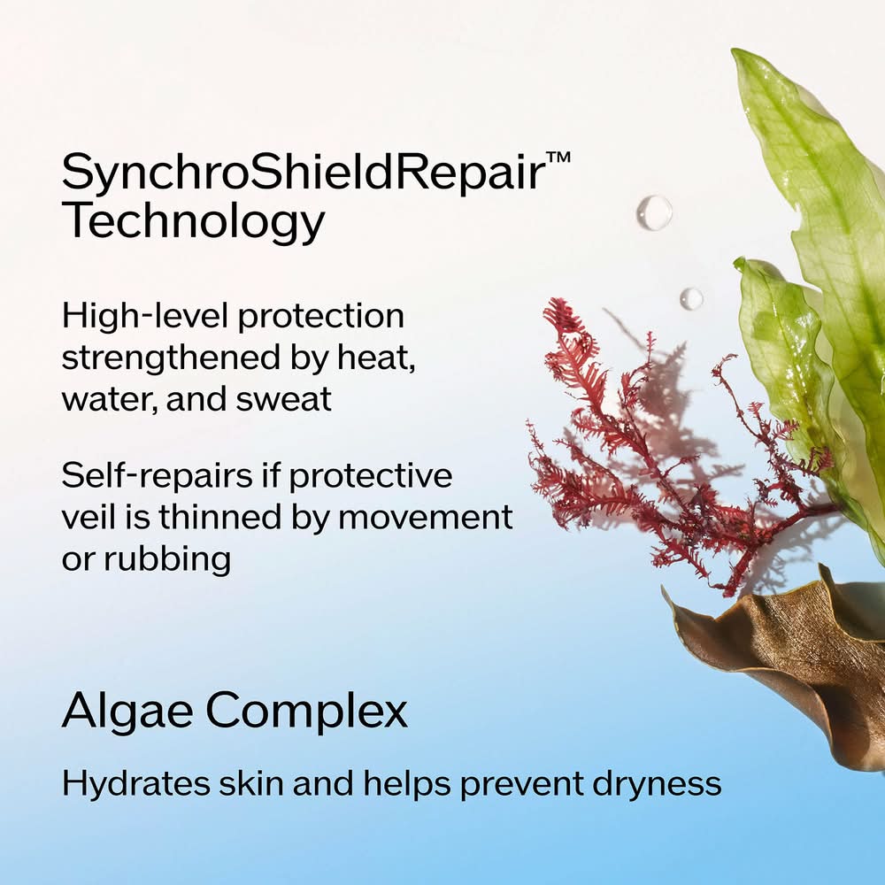 Ingredients: -SynchroShieldRepair™ Technology: Protection veil becomes stronger with contact to heat and water, and also self-repairs if the veil is thinned by movement or rubbing.-Algae Complex: Prevents dryness and hydrates.-Licorice Root Extract: Known to soothe breakout-prone skin.Avobenzone 2.3%, Sunscreen Homosalate 10.0%, Sunscreen Octisalate 5.0%, Sunscreen Octocrylene 5.0%, Water, Diisopropyl Sebacate, Talc, Triethylhexanoin, Dimethicone, Peg/Ppg-9/2 Dimethyl Ether, Alcohol Denat., Lauryl Peg-9 Polydimethylsiloxyethyl Dimethicone, Glycerin, Dextrin Palmitate, Sucrose Tetrastearate Triacetate, Isododecane, Ppg-3 Dipivalate, Trimethylsiloxysilicate, Silica, Disteardimonium Hectorite, Hydrogenated Polyisobutene, Sodium Chloride, Dipotassium Glycyrrhizate, Aminoethanesulfinic Acid, Peg/Ppg-14/7 Dimethyl Ether, Saxifraga Sarmentosa Extract, Camellia Sinensis Leaf Extract, Eucheuma Serra/Grateloupia Sparsa/Saccharina Angustata/Ulva Linza/Undaria Pinnatifida Extract, Sophora Angustifolia Root Extract, Saccharina Angustata/Undaria Pinnatifida Extract, Ppg-17, Peg-9 Polydimethylsiloxyethyl Dimethicone, Calcium Stearate, Isostearic Acid, Palmitic Acid, Trisodium Edta, Alcohol, Silica Dimethyl Silylate, Peg-6, Bht, Tocopherol, Butylene Glycol, Stearic Acid, Sodium Metabisulfite, Polyglyceryl-6 Polyricinoleate, Bis-Butyldimethicone Polyglyceryl-3, Syzygium Jambos Leaf Extract, Phenoxyethanol, Fragrance, Red 33, Yellow 5.