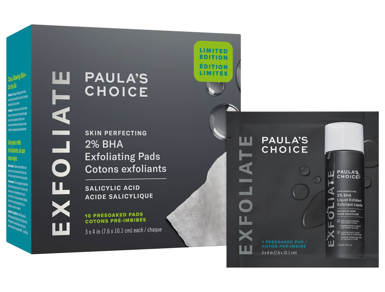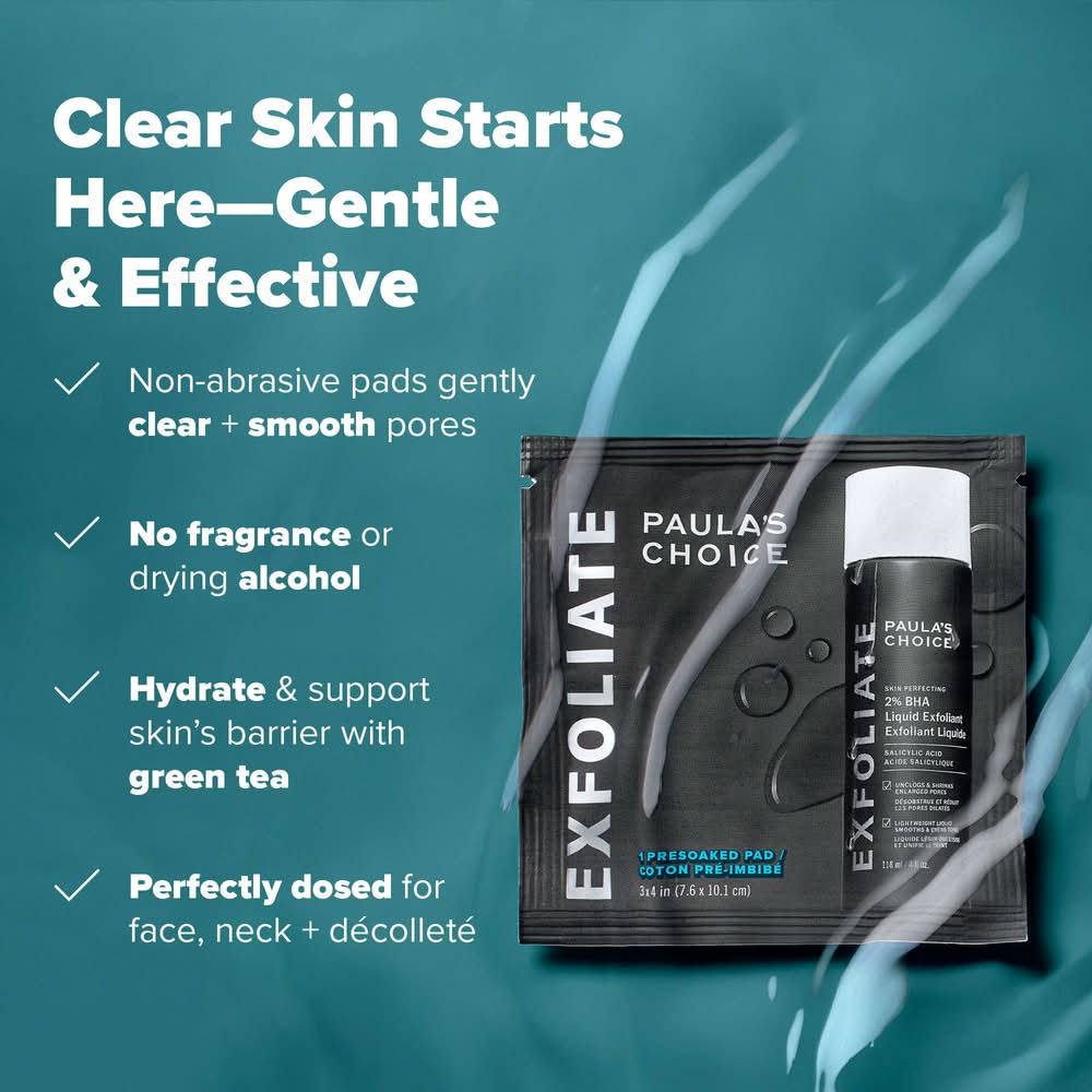 What it is: A set of pads pre-soaked in Paula Choice’s bestselling 2% BHA—in one swipe, target clogged pores, smooth the look of texture, and hydrate for visibly clear, glowing skin. Skin Type: Normal, Dry, Combination, and Oily Skincare Concerns: Pores, Dullness, and Acne and Blemishes Formulation: Wipes Highlighted Ingredients: - 2% BHA Beta Hydroxy Acid: Penetrates pores to fight blemish-causing buildup and dead skin.- Green Tea Extract: A potent antioxidant that quickly calms redness and soothes the skin barrier.- Methylpropanediol: Hydrates and prevents water loss while visibly improving skin’s glow. Ingredient Callouts: Free of parabens, formaldehydes, formaldehyde-releasing agents, phthalates, mineral oil, retinyl palmitate, oxybenzone, coal tar, hydroquinone, sulfates SLS & SLES, triclocarban, triclosan, and contains less than one percent synthetic fragrance. It is also vegan, gluten-free, and cruelty-free. What Else You Need to Know: Exfoliation made easy. Infused with salicylic acid and green tea, these biodegradable,* mess-free pads are designed for use on your face, neck, and body to target congestion, address oil, and support cell turnover. Use regularly for a glowing, makeup-ready complexion. *ASTM D5511 Anaerobic Biodegradability test Clinical Results: In independent clinical studies and self-assessment consumer panels, results showed:• Smaller pores and visibly clear, glowing skin in as little as 1 week In an independent clinical study with 29 subjects: • Clinically shown to boost cell turnover In an independent clinical study with 33 subjects, after 1 week: • Clinically proven to visibly reduce blackheads and whiteheads Size: 10 pads/pack