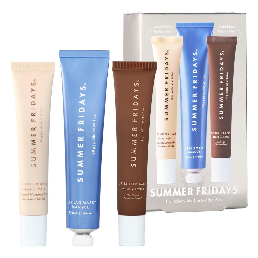 What it is: A holiday trio featuring Summer Fridays’ Mini Jet Lag Mask and two limited-edition flavors of Lip Butter Balm—Hot Cocoa and Toasted Marshmallow. Ingredient Callouts: Free of parabens, phthalates, and sulfates SLS & SLES. These products are also vegan. What Else You Need to Know: Nourish dull, depleted skin with Mini Jet Lag Mask and add a swipe of buttery hydration with Lip Butter Balm in two holiday exclusive flavors: Hot Cocoa, a warm chocolate color with a hint of rich cocoa sweetness; and Toasted Marshmallow, a touch of golden shimmer with a hint of toasted marshmallow flavor. This Set Contains: - 1 oz/ 28 mL Jet Lag Mask- 0.5 oz/ 15 mL Lip Butter Balm Toasted Marshmallow- 0.5 oz/ 15 mL Lip Butter Balm Hot Cocoa