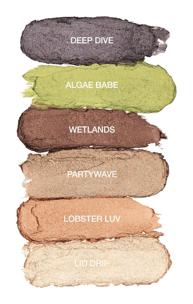 Ingredients: -Ceramides-Caffeine-Glycerin Partywave: Aqua (Water, Eau), Butylene Glycol, Mica, Sodium Stearate, Synthetic Fluorphlogopite, Glycerin, Sorbitan Isostearate, Dimethicone, Sorbitan Stearate, Calcium Sodium Borosilicate, Ceramide NP, Eriobotrya Japonica Leaf Extract, Caffeine, Silica, Hydroxyethylcellulose, Silica Silylate, Polysorbate 60, Disodium Phosphate, Sodium Phosphate, Phenoxyethanol, Citric Acid, Sodium Hydroxide, Tin Oxide, CI 77891 (Titanium Dioxide), CI 77491/CI 77492/CI 77499 (Iron Oxides). Lid Drip: Aqua (Water, Calcium Aluminum Borosilicate, CI 77491/CI 77492/CI 77499 (Iron Oxides). Algae Babe: Aqua (Water, CI 77288 (Chromium Oxide Greens), CI 77491/CI 77492/CI 77499 (Iron Oxides). Wetlands: Aqua (Water, CI 77491/CI 77492/CI 77499 (Iron Oxides). Lobster Luv: Aqua (Water, CI 77491/CI 77492/CI 77499 (Iron Oxides). Deep Dive: Aqua (Water, CI 77491/CI 77492/CI 77499 (Iron Oxides). .The list of ingredients is subject to change, please consult the packaging of the product purchased.