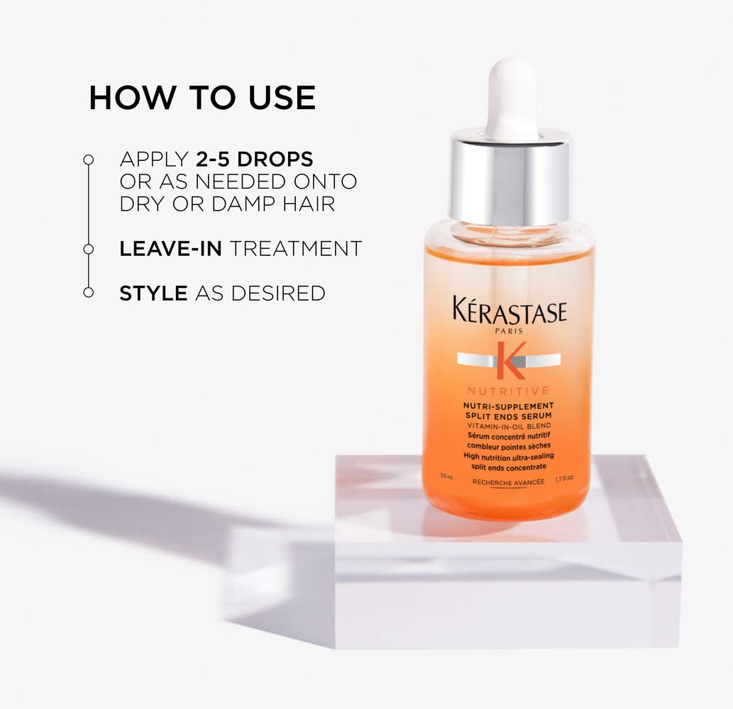What it is: An intensely nourishing hair oil that seals and reduces split ends while providing instant smoothness, shine, and preventing future damage. Hair Texture: Straight, Wavy, Curly, and Coily Hair Type: Fine, Medium, and Thick Hair Concerns: - Dryness - Shine - Damage, Split Ends, and Breakage Key Benefits: - Seals and reduces split ends for a smooth finish - Reduces breakage and prevents future damage - Intensely nourishes, and adds shine Highlighted Ingredients: - Plant-Based Proteins: Nourishes hair with essential nutriments and helps retain moisture. - Niacinamide: Locks in hydration for long-lasting hair strength. What Else You Need to Know: This intensely nourishing hair oil reduces split ends and adds deep nutrition to dry hair to instantly smooth and add shine. It is formulated with plant-based proteins and niacinamide to prevent future damage and reduce split by providing stronger hair and more shine. This serum is also recommended by pro stylists for healthy hair and is the perfect addition to any haircare routine for hydrated and nourished hair with a radiant shiny finish. Fragrance Description: This serum smells like a fresh and floral composition, with top notes of ylang, royal jelly, and violet leaves for a clean scent, middle notes of wild rose, jasmine, and tonka bean to capture the floral aroma, and bottom notes of sandalwood, white cedarwood, and cinnamon. Clinical Results: In a controlled study using Nutrititive Split End Serum for Dry Hair, results showed: - Hair was +81% shinier vs. unwashed hair - Hair was +99% stronger vs non-conditioning shampoo Size: 1.7 oz / 50 ml