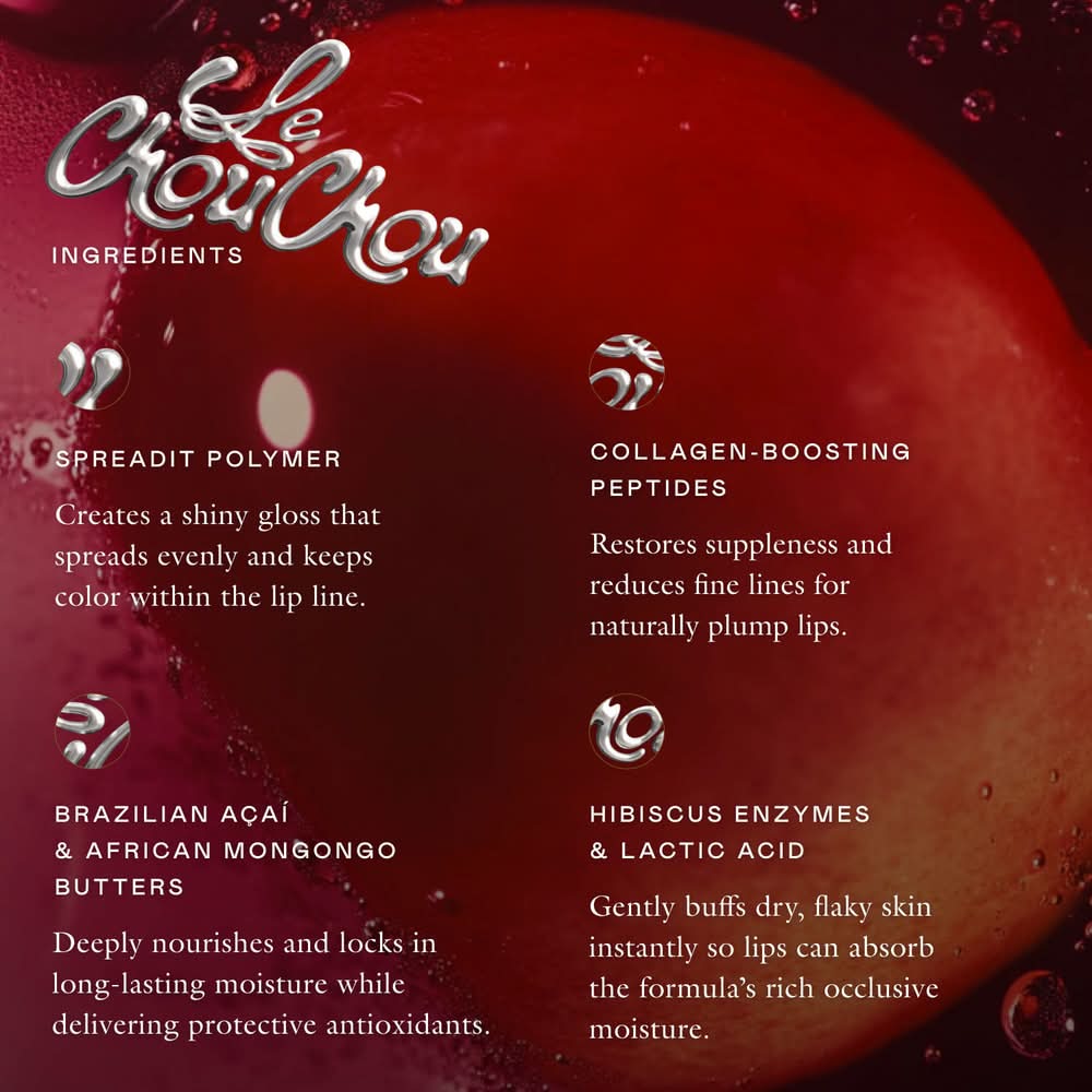 Ingredients: -Hibiscus Enzymes and Lactic Acid: Immediately buff away dry, flaky skin, so lips can absorb the balm's rich moisture.-Brazilian Açaí and African Mongongo Butters: Intensely nourish and lock in moisture, delivering protective antioxidants.-Collagen-Boosting Peptide: Restores a supple feel and visibly reduces fine lines for naturally plump-looking lips.Hydrogenated Polyisobutene, Diisostearyl Malate, Tridecyl Trimellitate, Phytosteryl/Isostearyl/Cetyl/Stearyl/Behenyl Dimer Dilinoleate, Bis-Diglyceryl Polyacyladipate-2, Methyl Hydrogenated Rosinate, Polyphenylsilsesquioxane, Pentaerythrityl Tetraisostearate, Ethylene/Propylene/Styrene Copolymer, Synthetic Wax, Silica Silylate, VP/Hexadecene Copolymer, Hibiscus Sabdariffa Flower Extract, Butyrospermum Parkii (Shea) Butter, Euterpe Oleracea Fruit Oil, Schinziophyton Rautanenii Kernel Oil, Tocopherol, Microcrystalline Wax, Moringa Oil/Hydrogenated Moringa Oil Esters, Isostearyl Alcohol, Water/Aqua/Eau, Ethylhexyl Palmitate, Octyldodecanol, Flavor (Aroma), Caprylic/Capric Triglyceride, Tribehenin, Sorbitan Isostearate, Propylene Carbonate, Stearalkonium Hectorite, Lactic Acid, Palmitoyl Hexapeptide-12, Palmitoyl Tripeptide-1, Butylene/Ethylene/Styrene Copolymer, Pentaerythrityl Tetra-di-t-butyl Hydroxyhydrocinnamate, Linalool, Iron Oxides (CI 77491/77492/77499), Titanium Dioxide (CI 77891), Red 7 Lake (CI 15850), Yellow 5 Lake (CI 19140).The list of ingredients is subject to change. Please consult the packaging of the product purchased.