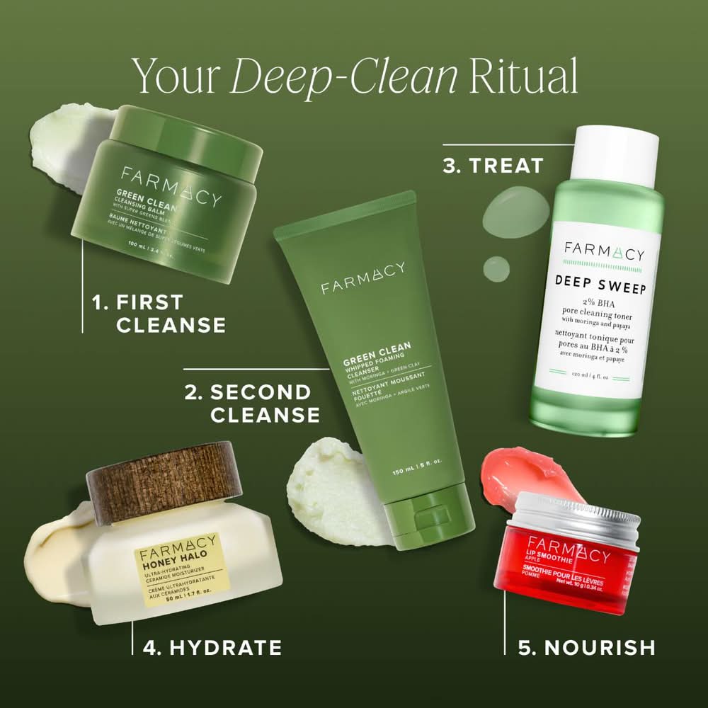 What it is: A new and improved cleansing balm clinically shown to gently remove over 99 percent of SPF, foundation, and waterproof mascara, leaving skin feeling smooth and hydrated. Skin Type: Normal, Dry, Combination, and Oily Skincare Concerns: Pores, Dryness, and Dullness Formulation: Balm Highlighted Ingredients: - Super Greens Blend: Rich in antioxidants to promote healthier-looking skin. - Sunflower Oil: Melts away makeup and leaves skin nourished. - Papaya Extract: Cleanses and targets impurities. Ingredient Callouts: This product is cruelty-free. What Else You Need to Know: Transforming from a sorbet-like balm to a milky lather, Green Clean Cleansing Balm effortlessly removes sunscreen and makeup while leaving zero residue or breakouts and without stripping. An antioxidant-rich super-greens blend of moringa, holy basil, and arugula support healthier-looking skin. Clinical Results: In clinical testing on 31 participants, average results after 1 cleanse showed: - Removes over 99% of long-wearing lipstick, foundation, waterproof mascara, and SPF In clinical testing on 31 participants: - 100% had softer + smoother-feeling skin after 1 cleanse In a consumer panel with 31 subjects, after 1 cleanse: - 96% agreed Green Clean Cleansing Balm made skin feel smoother, softer, and more hydrated