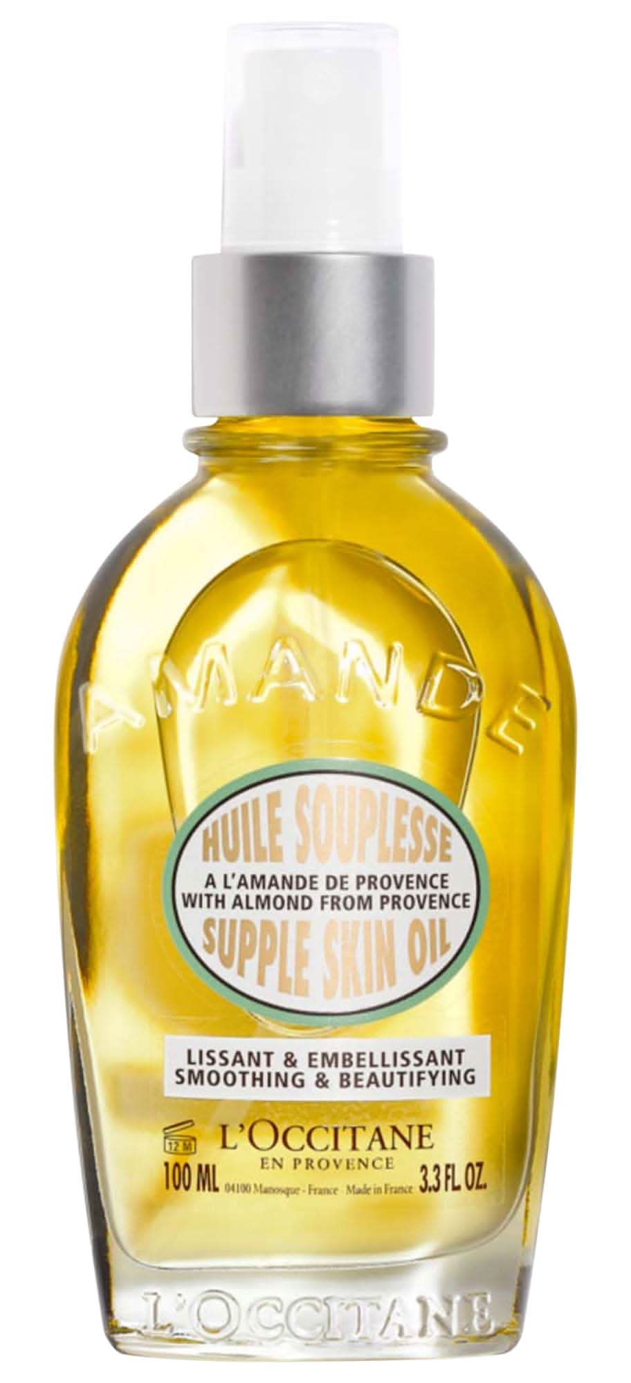 Ingredients: -Sweet Almond Oil: Softens and nourishes skin with oil from almonds grown in Provence.Prunus Amygdalus Dulcis (Sweet Almond) Oil, Caprylic/Capric Triglyceride, Parfum/Fragrance, Oleyl Alcohol, Camelina Sativa Seed Oil, Rosa Canina Fruit Oil, Helianthus Annuus (Sunflower) Seed Oil, Citrus Aurantium Bergamia (Bergamot) Fruit Oil, Daucus Carota Sativa (Carrot) Seed Oil, Hippophae Rhamnoides Oil, Dioleyl Tocopheryl Methylsilanol, Tocopherol, Limonene, Coumarin, Linalool, Citral.