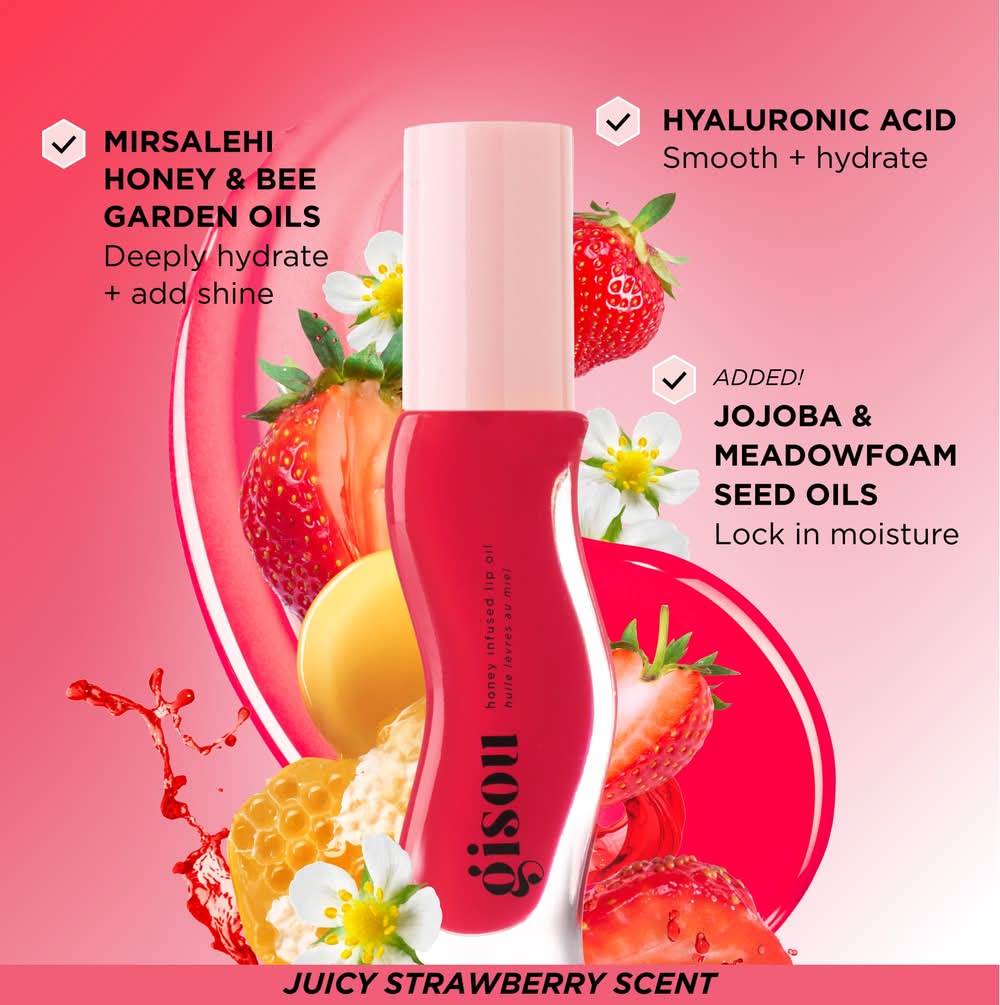 What it is: A lip oil powered by Mirsalehi honey and bee garden oils to intensely hydrate lips and lock in moisture with a high-shine and non-sticky finish. Formulation Type: Lip Gloss Benefits: Hydrating Highlighted Ingredients: - Mirsalehi Honey: A powerful humectant that attracts and retains moisture.- Mirsalehi Bee Garden Oils: Rich, antioxidant powerhouse oils that replenish, lock in moisture, and add shine.- Hyaluronic Acid: Delivers added hydration and smooths. Ingredient Callouts: Free of parabens, formaldehydes, formaldehyde-releasing agents, phthalates, mineral oil, retinyl palmitate, oxybenzone, coal tar, hydroquinone, sulfates SLS & SLES, triclocarban, triclosan, and contains less than one percent synthetic fragrance. It is also cruelty-free. What Else You Need to Know: Formulated with a blend of nourishing Mirsalehi honey, bee garden oils, and hyaluronic acid, this bestselling lip oil delivers long-lasting hydration and high shine to quench chapped lips with juicy a scent and touch of color. Gisou’s non-sticky formula smooths and locks in moisture throughout the day. Gisou proudly derives their cruelty-free Mirsalehi honey from their own Gisou Bee Garden in The Netherlands, where the family tradition of beekeeping has continued for six generations. Color: Strawberry sorbet