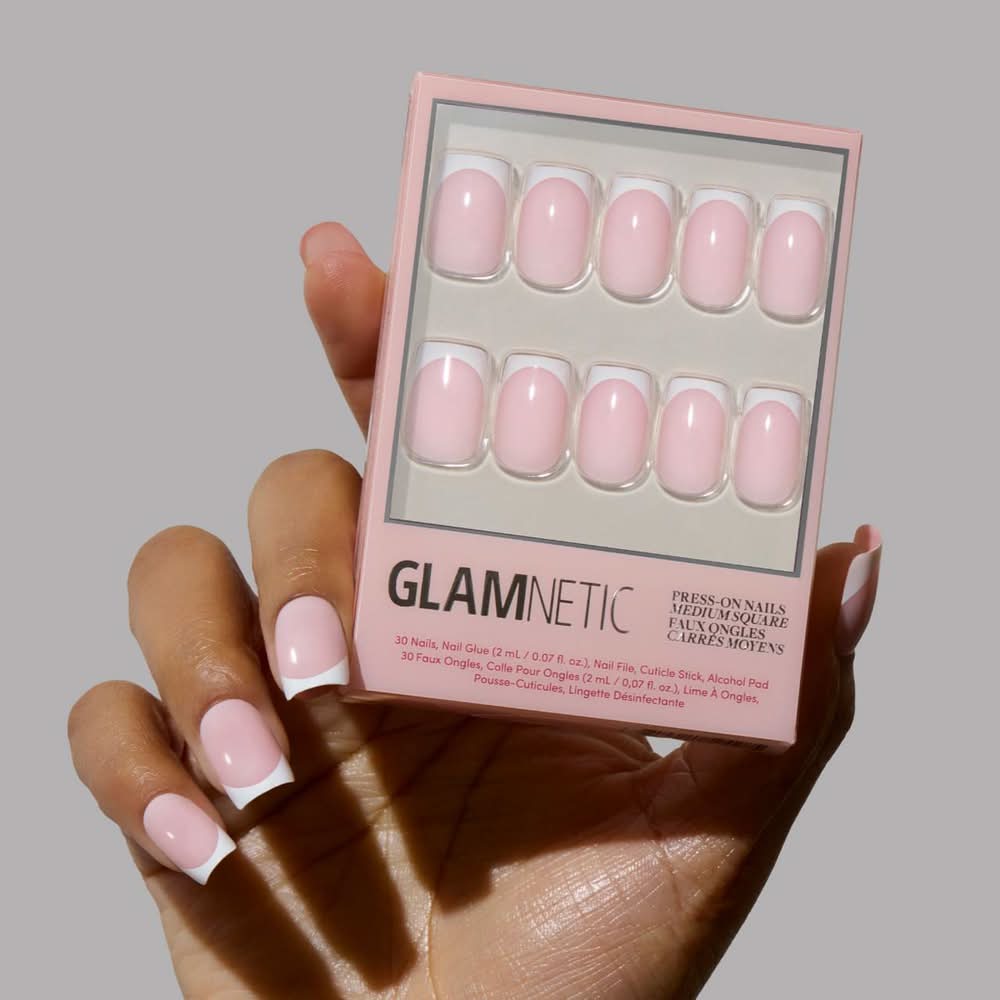 What it is: A set of easy-to-apply, reusable, and mess-free press-on nails in an array of styles perfect for creating salon-quality manicures, at home, within minutes. Ingredient Callouts: Free of parabens, formaldehydes, formaldehyde-releasing agents, phthalates, mineral oil, retinyl palmitate, oxybenzone, coal tar, hydroquinone, sulfates SLS & SLES, triclocarban, triclosan, and contains less than one percent synthetic fragrance. It is also vegan, gluten-free, and cruelty-free. What Else You Need to Know: Skip the salon and get results you love, at home, in minutes with Glamnetic’s Press-On Nail Kit. In a variety of styles and shapes, each easy-to-apply kit includes all the tools you need for a flawless mani, featuring reusable nails designed for durability with up to two weeks of wear. This Set Contains: - 30 x Glamnetic Nails (15 sizes x 2) - 0.07 oz/ 2 mL Nail Glue - Nail file - Cuticle stick - Alcohol pad Color: Classy french