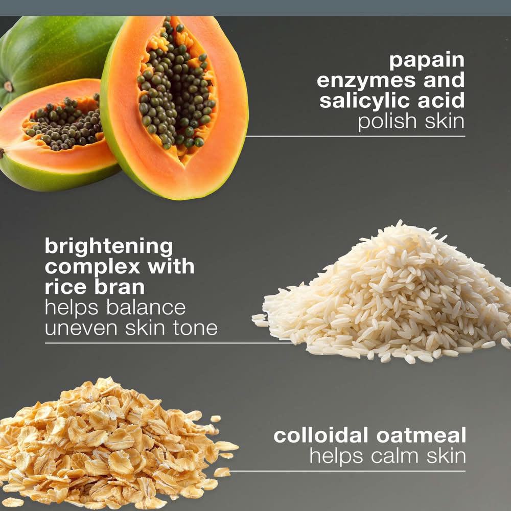 Ingredients: -Papain Enzymes and Salicylic Acid: Draw out excess oil, clear clogged pores, and smooth the look of skin.-Rice Bran-Derived Phytic Acid: Gently exfoliates to visibly brighten and balance uneven skin tone.-Colloidal Oatmeal: Calms skin, reducing the appearance of redness and irritation.Microcrystalline Cellulose, Magnesium Oxide, Sodium Cocoyl Isethionate, Colloidal Oatmeal, Disodium Lauryl Sulfosuccinate, Sodium Lauroyl Glutamate, Oryza Sativa (Rice) Bran Extract, Oryza Sativa (Rice) Starch, Hydrogenated Coconut Acid, Allantoin, Papain, Salicylic Acid, Ginkgo Biloba Leaf Extract, Camellia Sinensis Leaf Extract, Glycyrrhiza Glabra (Licorice) Root Extract, PCA, Populus Tremuloides Bark Extract, Cyclodextrin, Sodium Isethionate, Lauryl Methacrylate/Glycol Dimethacrylate Copolymer, Maltodextrin, Melaleuca, Alternifolia (Tea Tree) Leaf Oil, Citrus Paradisi (Grapefruit) Peel Oil, Sodium Dehydroacetate, Hydrolyzed Corn Starch Hydroxyethyl Ether, Water/Aqua/Eau, Limonene, Citric Acid.
