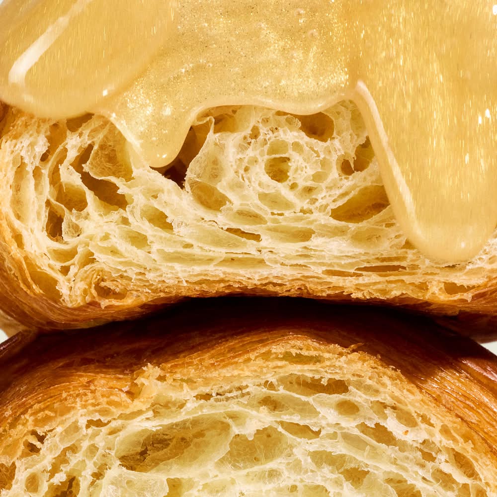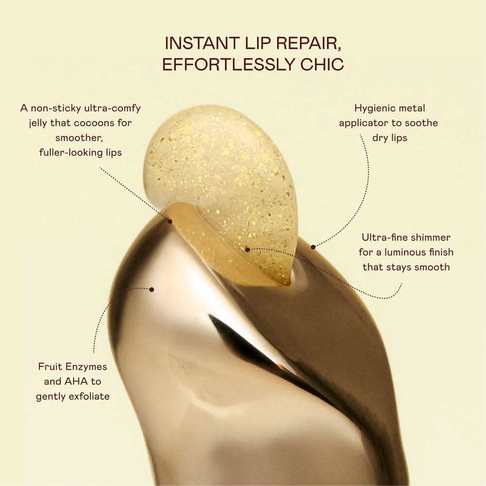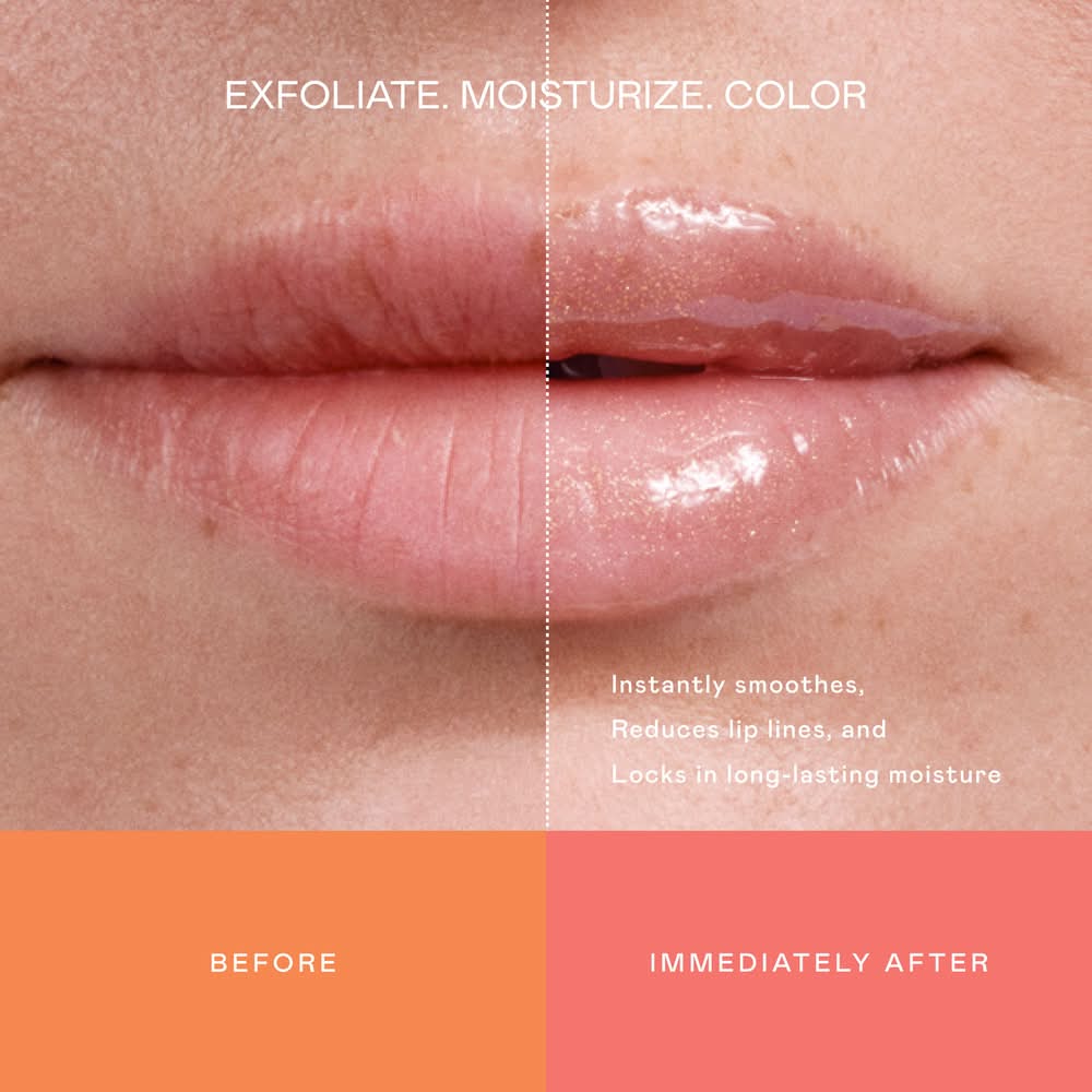 What it is: An exfoliating-to-moisturizing lip balm with AHA + Peptides to smooth ashy, flaky skin, reduce lip wrinkles, and lock in moisture with a glossy finish. Skin Type: Normal, Dry, Combination, and Oily Skincare Concerns: Fine Lines and Wrinkles, Dryness, and Dullness Formulation: Balm Highlighted Ingredients: - Hibiscus Enzymes and Lactic Acid: Immediately buff away dry, flaky skin, so lips can absorb the balm's rich moisture.- Brazilian Açaí and African Mongongo Butters: Intensely nourish and lock in moisture, delivering protective antioxidants.- Collagen-Boosting Peptide: Restores a supple feel and visibly reduces fine lines for naturally plump-looking lips. Ingredient Callouts: This product is gluten-free and cruelty-free. What Else You Need to Know: Transform parched lips into a pillowy pout with a 3-in-1 lip treatment that exfoliates, moisturizes, and adds a flush of color. The ultra-comfy formula cocoons lips in a bouncy, non-sticky gloss made with SpreadIt™ Polymer Technology, which glides color on evenly and locks it within your lip line. Color: Croissant au beurre - clear with shimmery gold