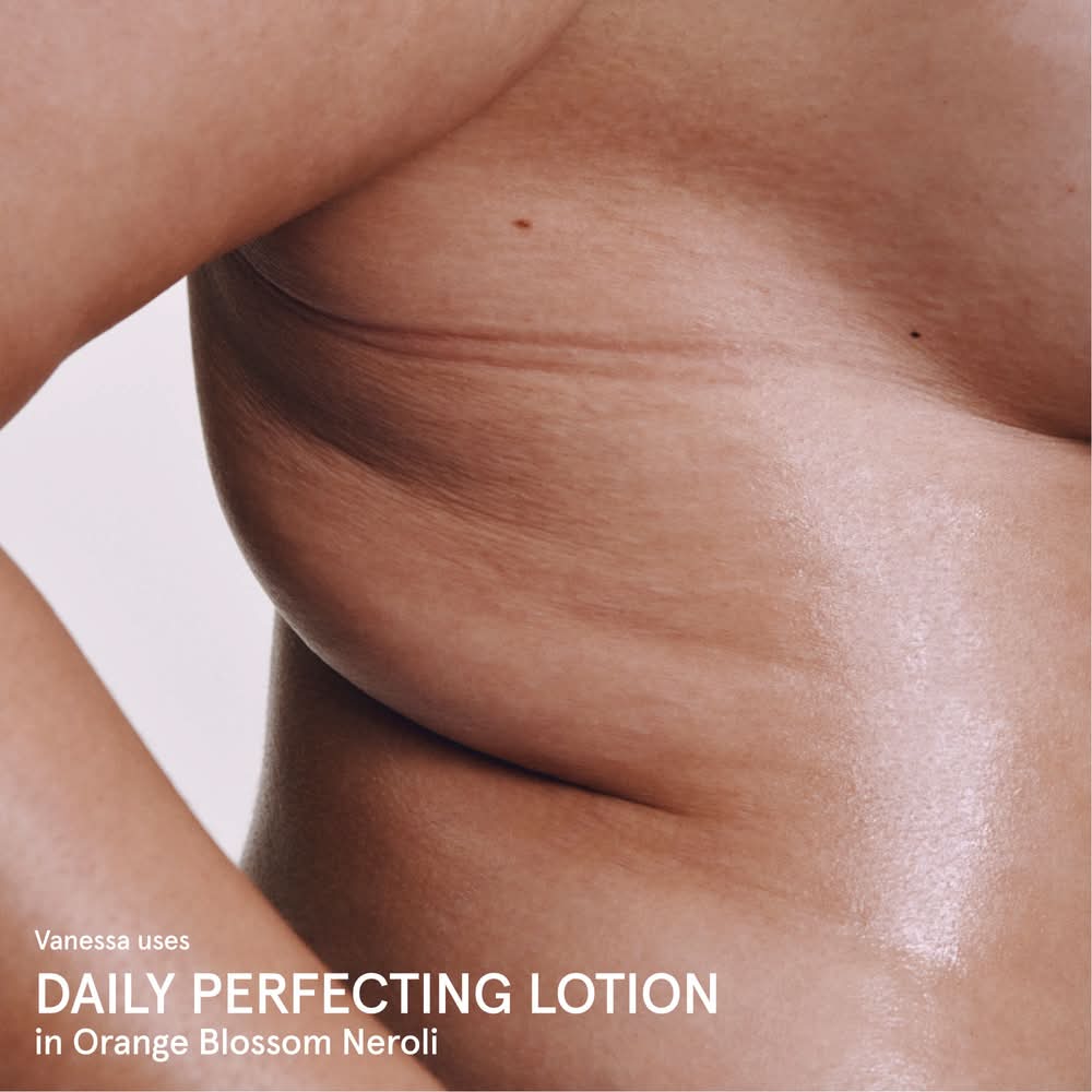 What it is: A body lotion that does more than just moisturize with a fast-absorbing formula that nourishes skin for a subtle, healthy-looking glow. Skincare Concerns: Dryness Highlighted Ingredients: - Avocado Oil: A nutrient-dense oil that boosts the skin’s moisture barrier and helps neutralize free radicals.- Apple Fruit Extract: A fast-acting humectant that rapidly attracts moisture.- Light Reflecting Pearl: Provides an instant, subtle sheen to skin. Ingredient Callouts: It is vegan and cruelty-free. What Else You Need to Know: A body lotion that does more than just moisturize, this fast-absorbing formula intensely nourishes skin while providing a subtle, healthy-looking glow. No more pesky residue or dry-down time. Just a silky, lightweight lotion inside a click-lock pump bottle for enhanced convenience and ease of use. Clinical Results: In a 2-week consumer study of 35 people between the ages of 23 and 54:- 100% agree Daily Perfecting Lotion feels fresh and is residue-free- 97% agree product is lightweight and glides beautifully on skin- 94% agree skin looks and feels immediately hydrated and replenished
