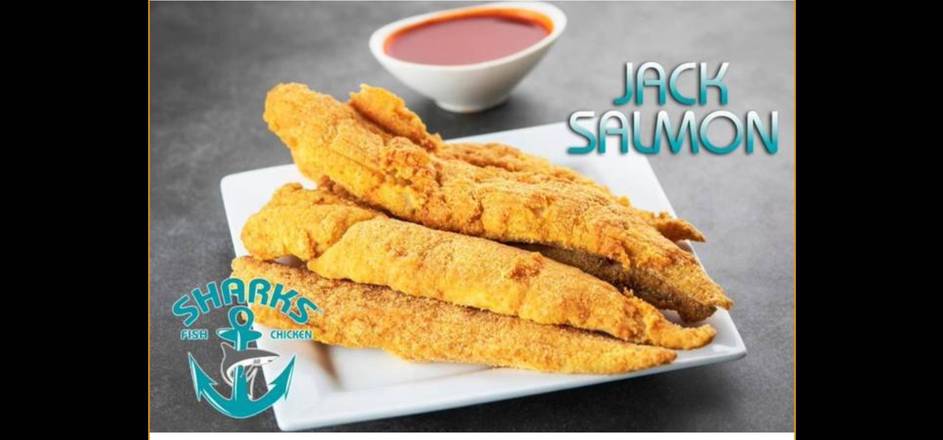 Crispy fried Jack Salmon with pepper, served with tartar sauce, fries, bread, and coleslaw.