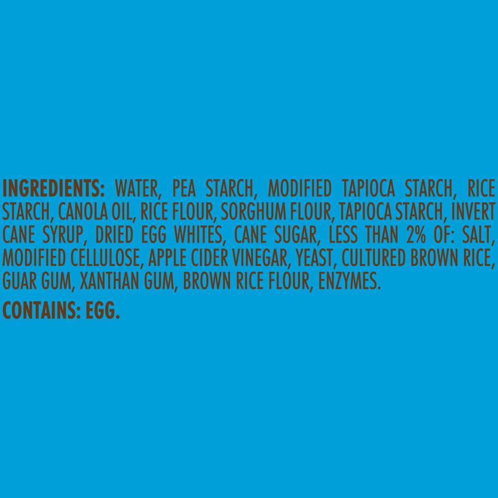 Ingredients: INGREDIENTS: WATER, PEA STARCH, MODIFIED TAPIOCA STARCH, RICE STARCH, CANOLA OIL, RICE FLOUR, SORGHUM FLOUR, TAPIOCA STARCH, INVERT CANE SUGAR, EGG WHITES, CANE SUGAR, MODIFIED CELLULOSE, APPLE CIDER VINEGAR, SALT, YEAST, CULTURED BROWN RICE, BROWN RICE, GUAR GUM, XANTHAN GUM, ENZYMES. Contains: Egg