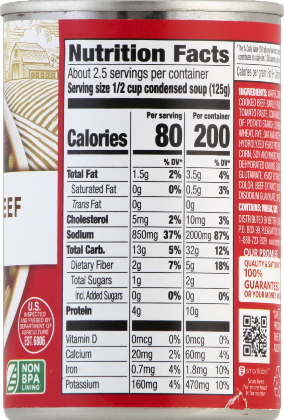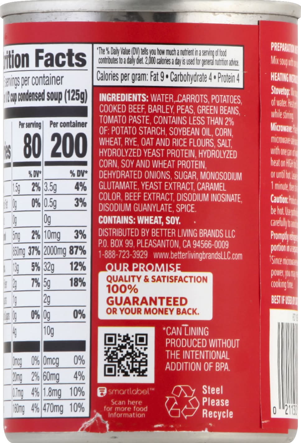 Soup, Condensed, Vegetable Beef • Number of servings: 2 • Packaging: Reusable