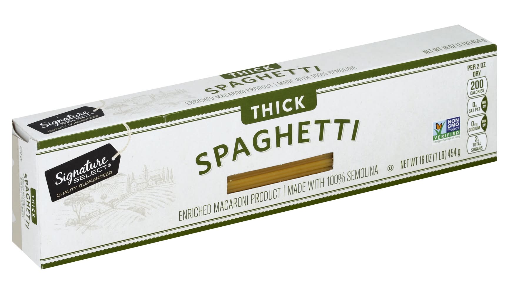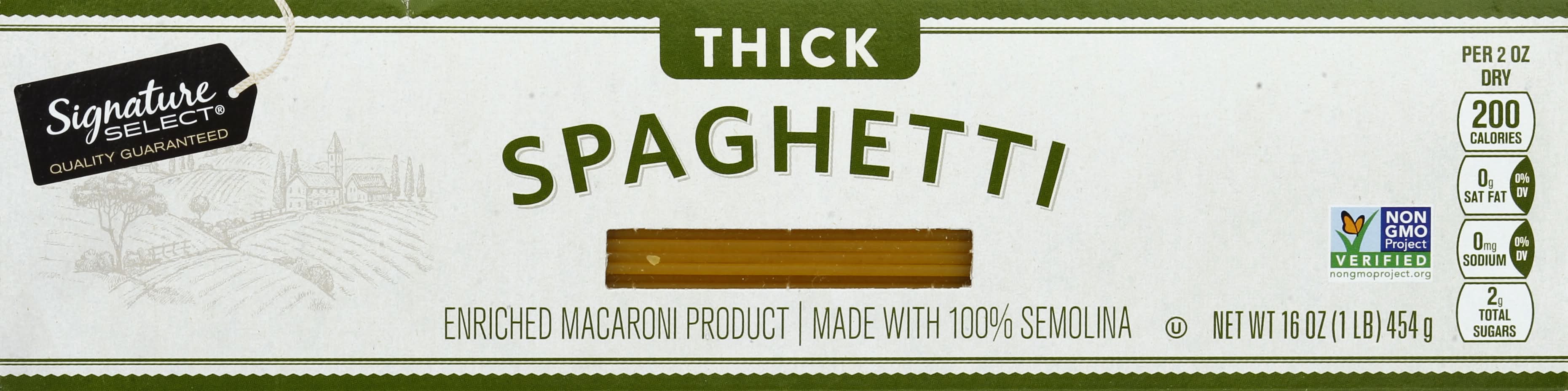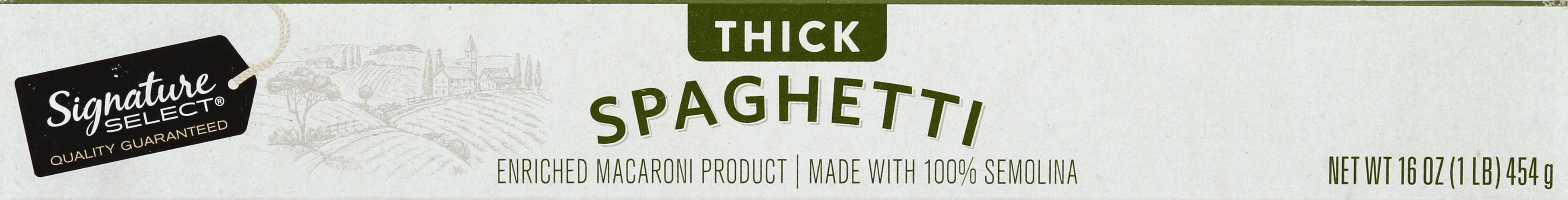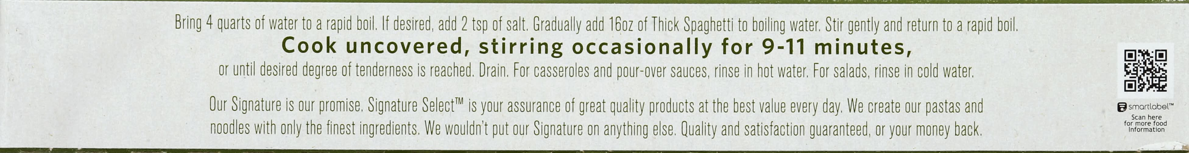 Bring 4 quarts of water to a rapid boil. if desired, add 2 tsp of salt. gradually add 16 oz of thick spaghetti to boiling water. stir gently and return to a rapid boil. cook uncovered, stirring occasionally for 9-11 minutes, or until desired degree of tenderness is reached. drain. for casseroles and pour-over sauces, rinse in hot water. for salads, rinse in cold water. store in a cool dry place.