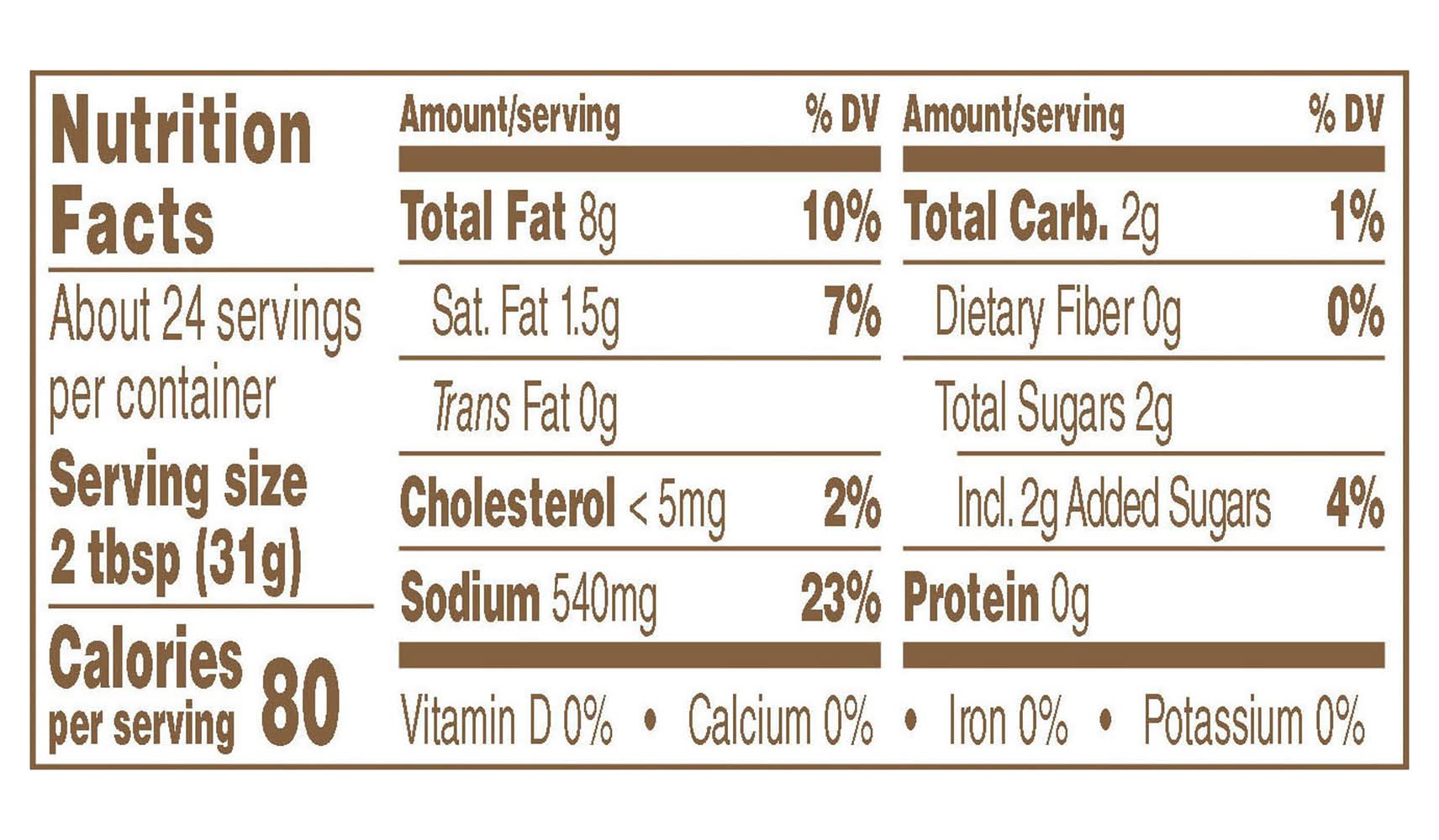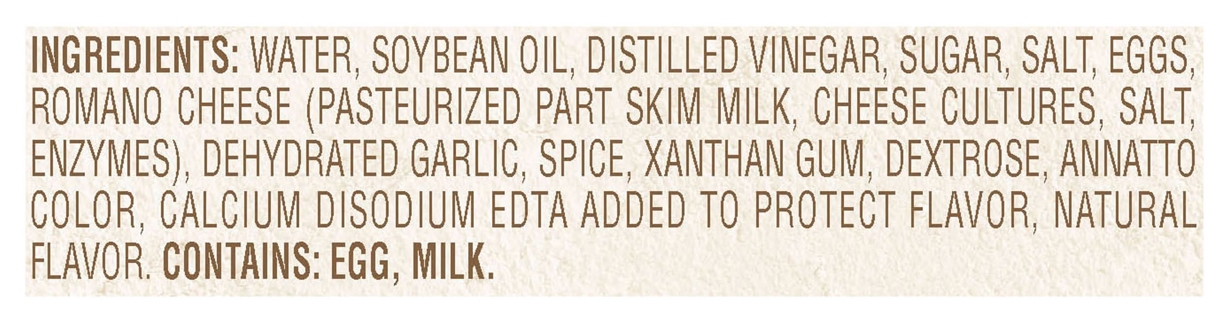 Ingredients: Water, Soybean Oil, Distilled Vinegar, Sugar, Salt, Eggs, Romano Cheese (Pasteurized Part Skim Milk, Cheese Cultures, Salt, Enzymes), Dehydrated Garlic, Spice, Xanthan Gum, Dextrose, Annatto Color, Calcium Disodium EDTA Added to Protect Flavor, Natural Flavor Contains: Soybeans, Eggs, Milk