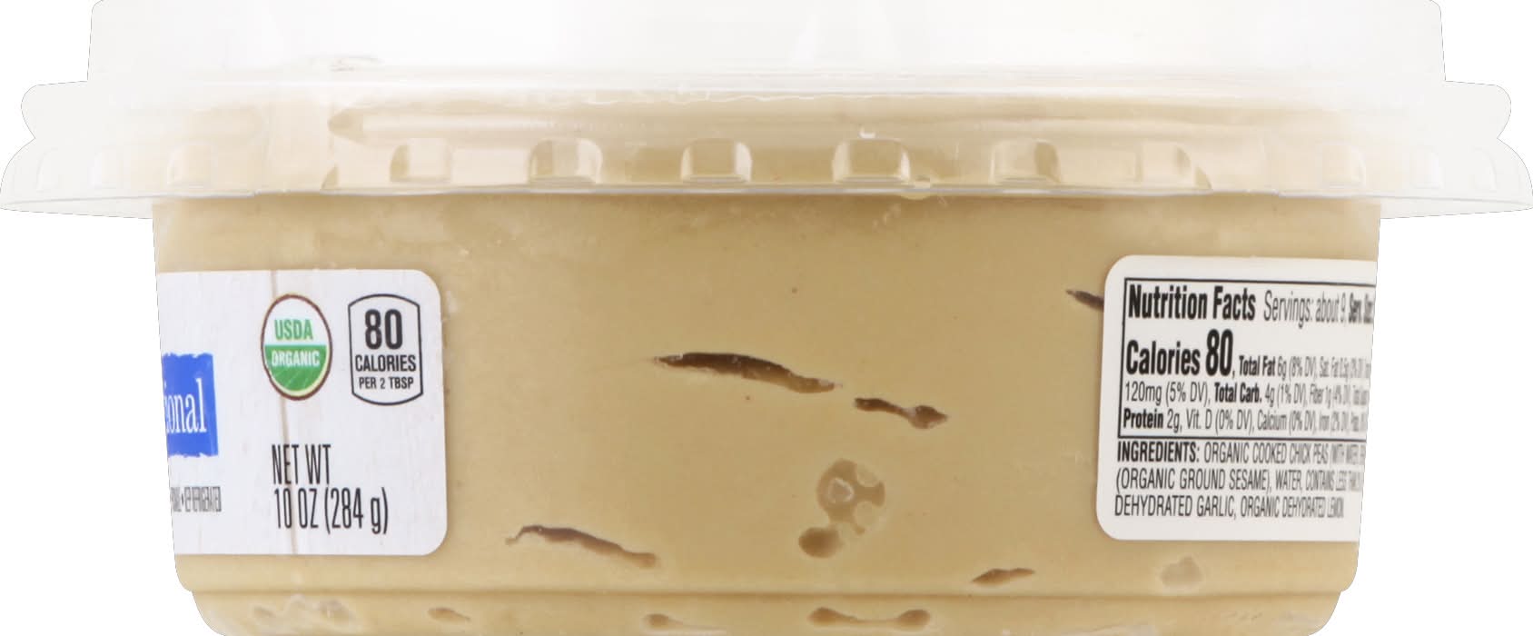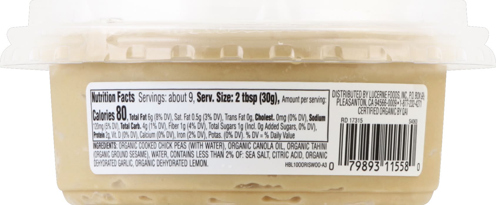 Ingredients: Organic Cooked Chick Peas (with Water), Organic Canola Oil, Organic Tahini (Organic Ground Sesame), Water, Contains Less than 2% of: Sea Salt, Citric Acid, Organic Dehydrated Garlic, Organic Dehydrated Lemon.