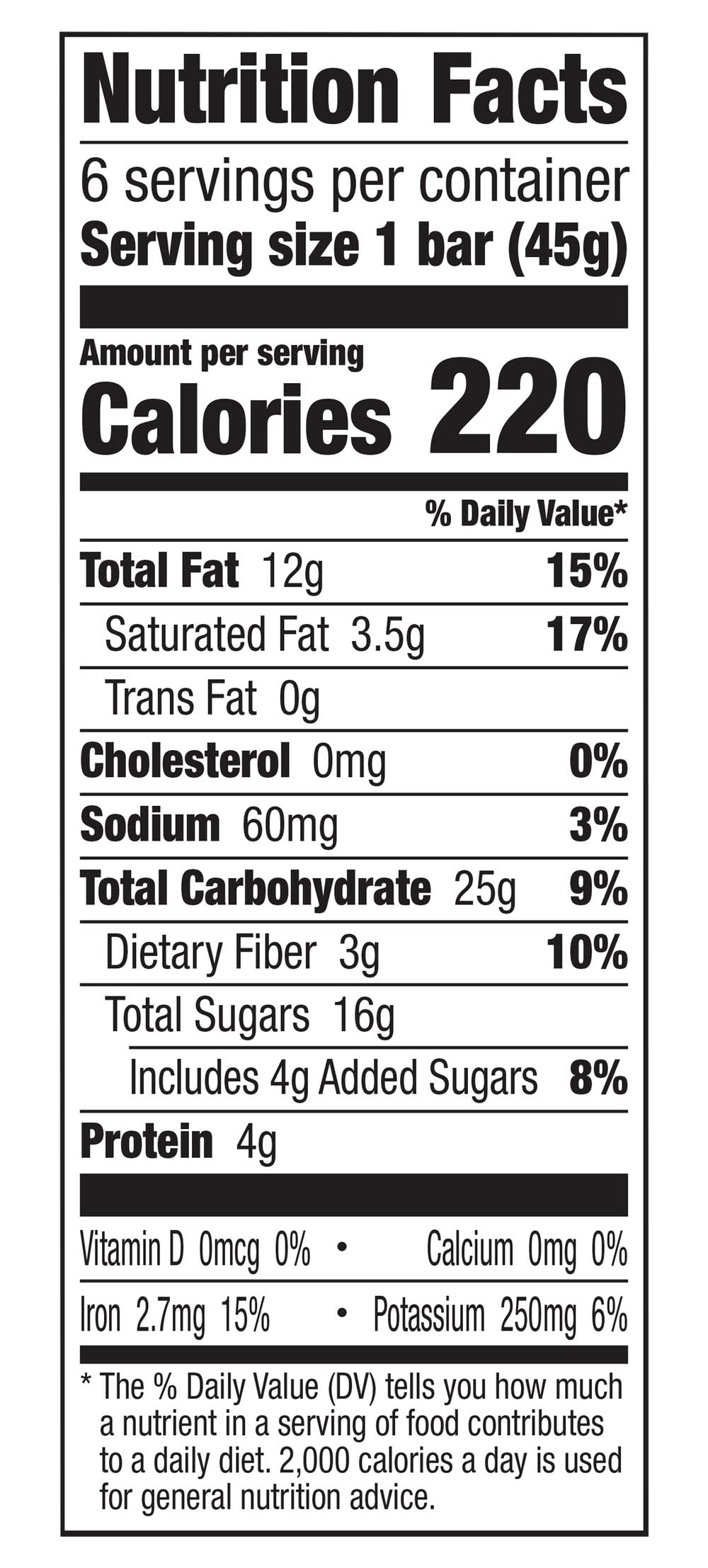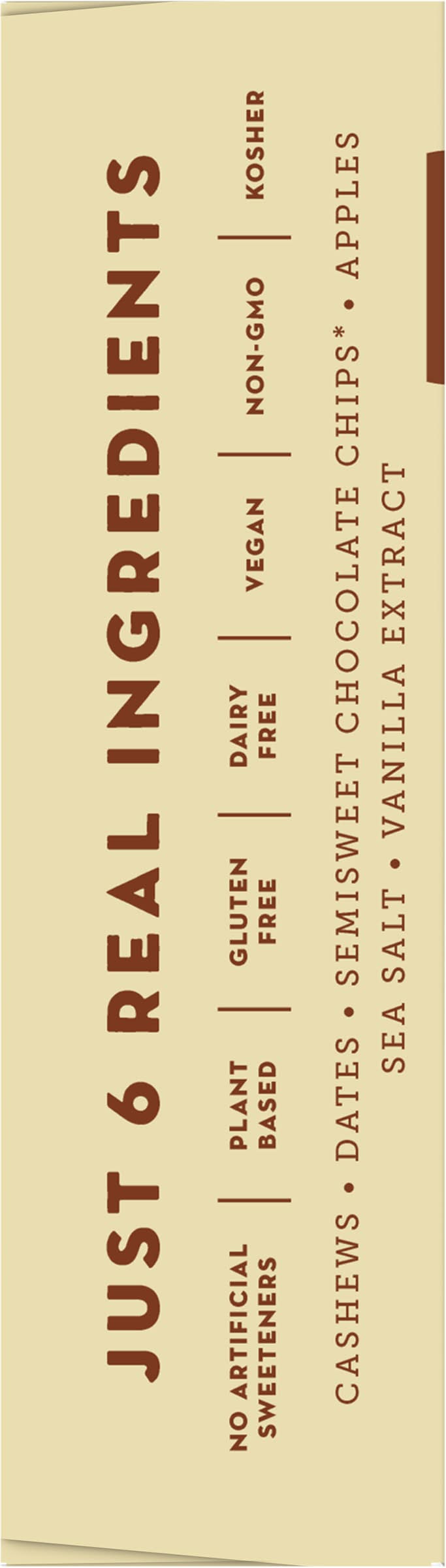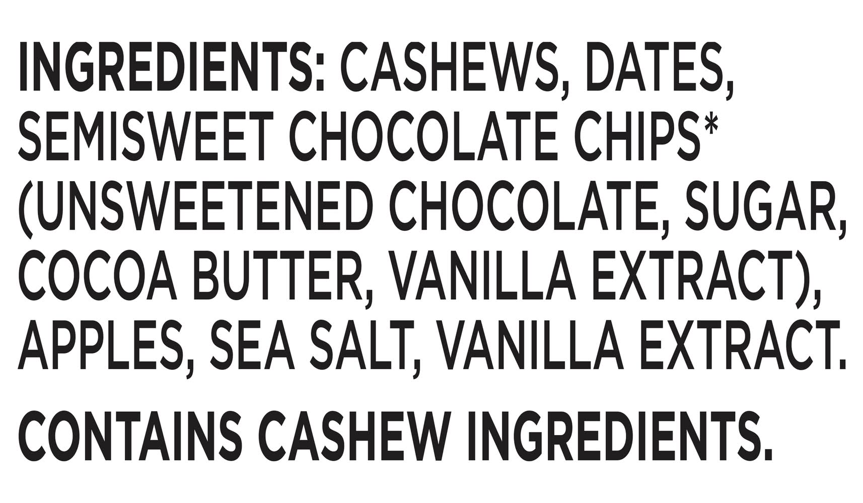 Ingredients: Cashews, Dates, Semisweet Chocolate Chips* (Unsweetened Chocolate, Sugar, Cocoa Butter, Vanilla Extract), Apples, Sea Salt, Vanilla Extract. * Fair Trade Certified by Fair Trade USA, at Least 20% Fair Trade Certified Ingredients