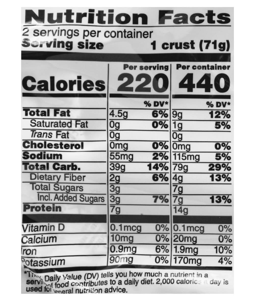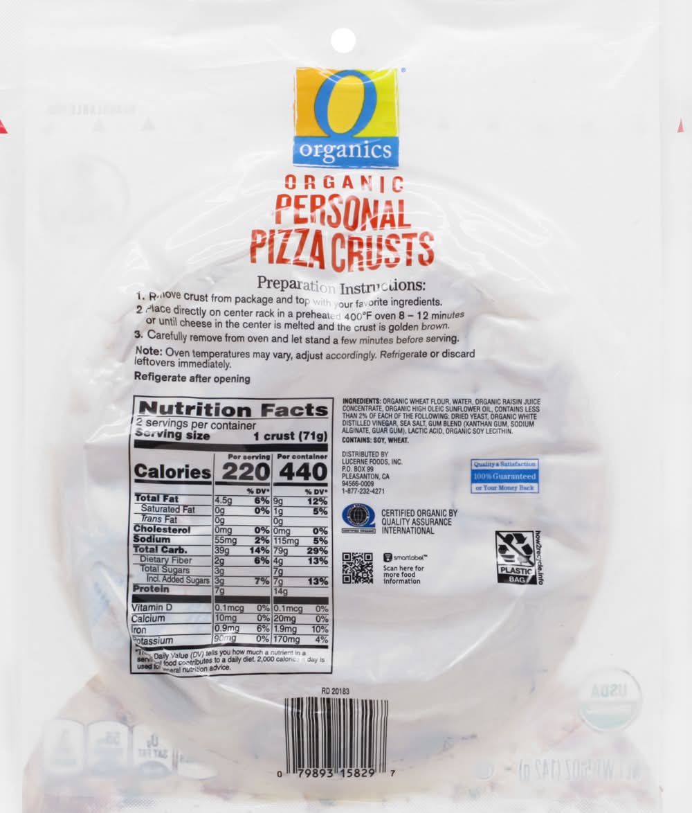 Per 1 Crust: 220 calories; 0 g sat fat (0% DV); 55 mg sodium (22% DV); 3 g total sugars. USDA Organic. Certified Organic by Quality Assurance International. Quality & satisfaction 100% guaranteed or your money back. how2recycle.info. SmartLabel: Scan for more food information. Resealable bag. • Number of servings: 2 • Lucerne Foods, Pleasanton, CA, 94566-0009 • Packaging: Reusable
