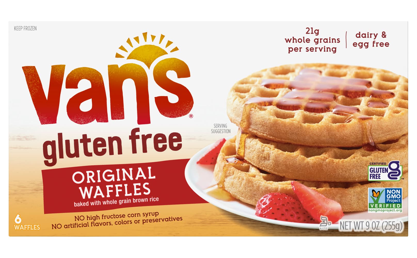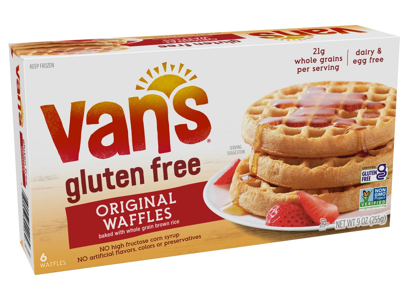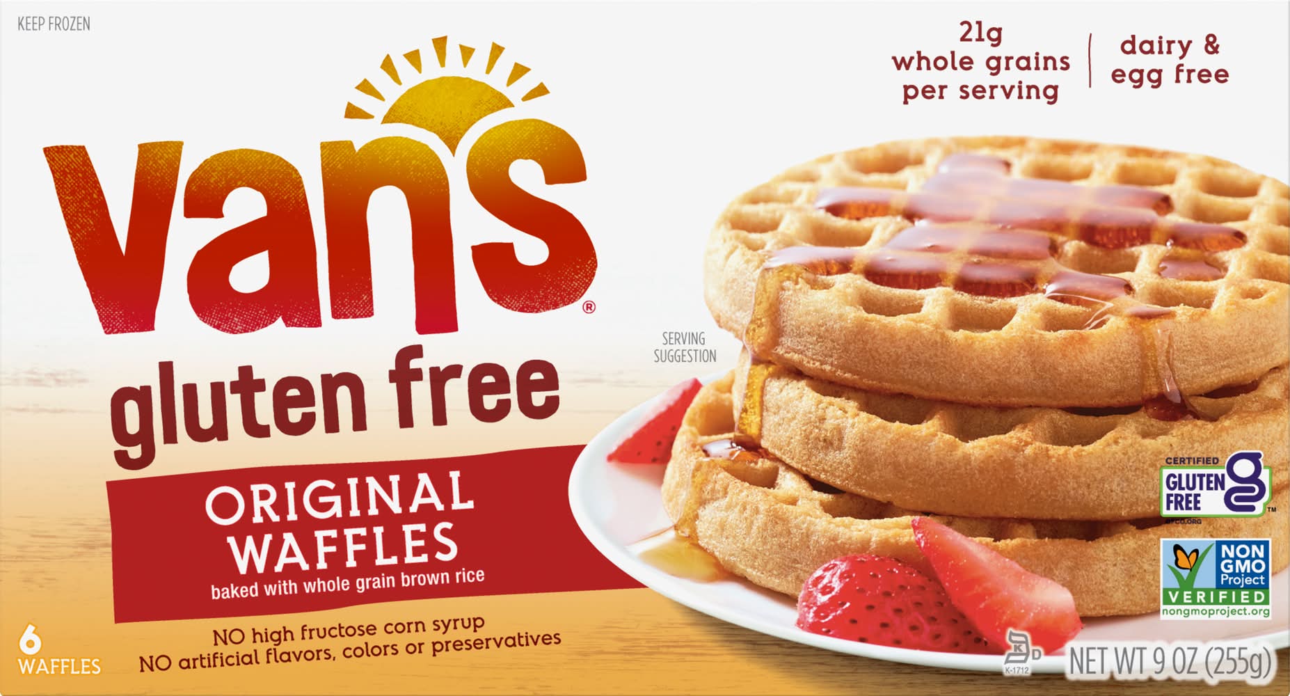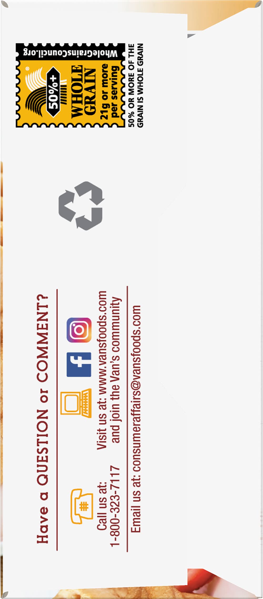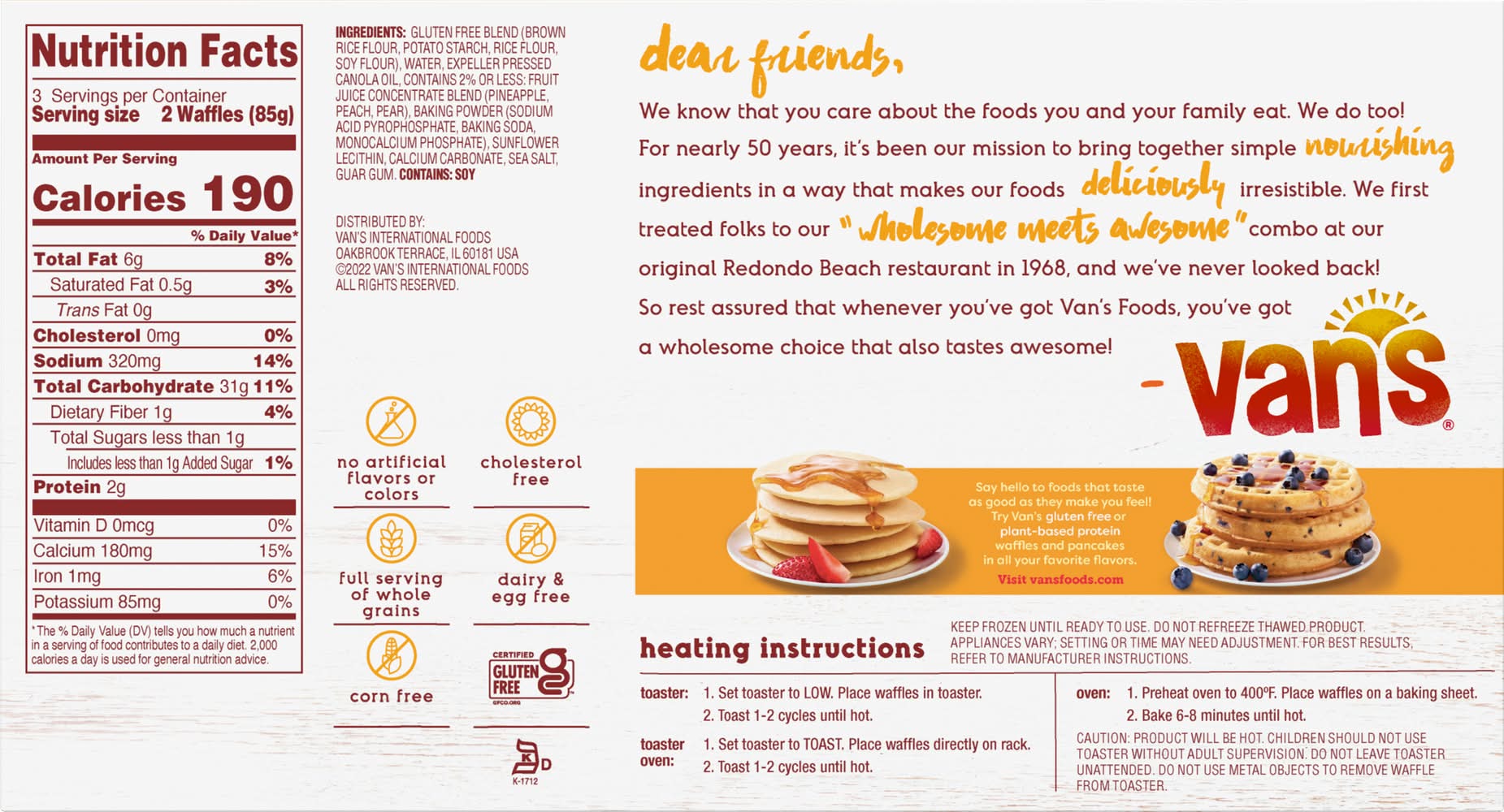Waffles baked with whole grain brown rice. No high fructose corn syrup. No artificial flavors, colors or preservatives. Full serving of whole grains. Corn free. Cholesterol free. Dear Friends, We know that you care about the foods you and your family eat. We do too! For nearly 50 years, it's been our mission to bring together simple nourishing ingredients in a way that makes our foods deliciously irresistible. We first treated folks to our wholesome meets awesome combo at our original Redondo Beach restaurant in 1968, and we've never looked back! So rest assured that whenever you've got Van's Foods, you've got a wholesome choice that also tastes awesome! - Van's. SmartLabel. 50%+ Whole Grain: 23 g or more per serving. 50% or more of the grain is whole grain. Wholesome meets awesome with Van's gluten free family, including our snack bars, cereals and waffles. Vans International Foods, San Diego, CA 92154, USA