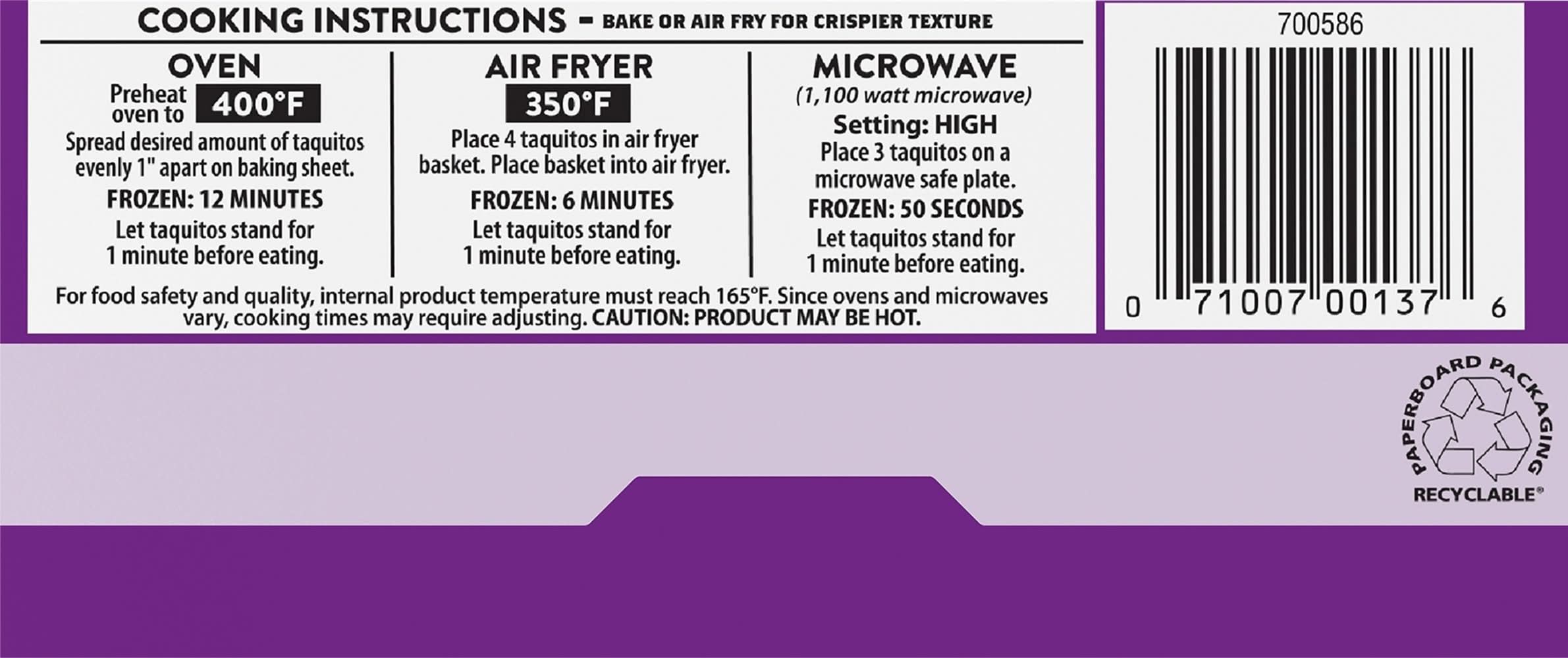 Directions for use: Cooking Instructions – Bake or air fry for crispier texture. Oven: Preheat oven to 400 degrees F spread desired amount of taquitos evenly 1 inch apart on baking sheet. Frozen: 12 minutes. Let taquitos stand for 1 minutes before eating. Air Fryer: 350 degrees place 4 taquitos in air fryer basket. Place basket into air fryer. Frozen: 6 minutes. Let taquitos stand for 1 minute before eating. Microwave: (1,100 watt microwave) setting: High place 3 taquitos on a microwave safe plate. Frozen: 50 seconds let taquitos stand for 1 minute before eating. For food safety and quality, internal product temperature must reach 165 degrees F. Since oven and microwaves vary, cooking times may requires adjusting. Caution: Product may be hot. Keep frozen. Storage recommendation: Keep frozen.