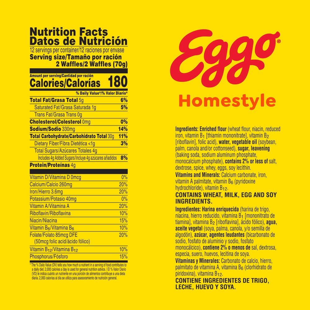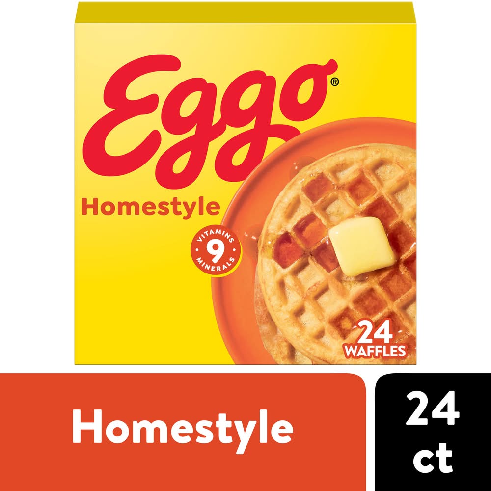 Wake up and greet the day with the feel-good taste of waffles. Deliciously crispy and fluffy, our Eggo Homestyle waffles are crafted with delicious ingredients for a quick and easy breakfast. Pop these frozen waffles in the toaster or oven for a delightfully crisp texture and the familiar, inviting taste of homemade waffles. These tasty frozen waffles are made with pantry-perfect staples; and every serving provides a good source of nine vitamins and minerals. Conveniently packaged and easy to prepare, Kellogg's Homestyle waffles help bring warmth and smiles to fast-paced, busy mornings. Great for families and individuals alike, these delicious, rich waffles are made to enjoy as part of a delicious breakfast. Try them with your favorite morning toppings such as butter and syrup, jellies and jam, peanut butter, hazelnut spread, fresh fruit, berries, whipped cream, and powdered sugar. • Flavor: Homestyle • Kellogg Sales Co., Battle Creek, MI, 49016 • Packaging: Reusable