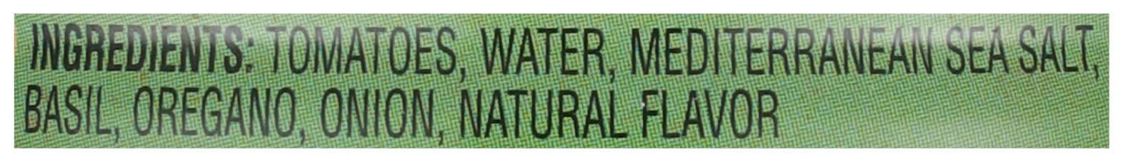 Ingredients: Tomatoes, Water, Mediterranean Sea Salt, Basil, Oregano, Onion, Natural Flavor Contains: 'Free From Gluten'