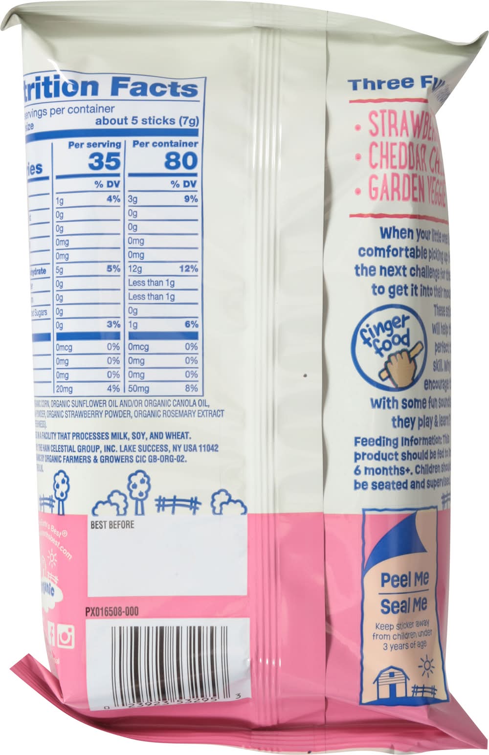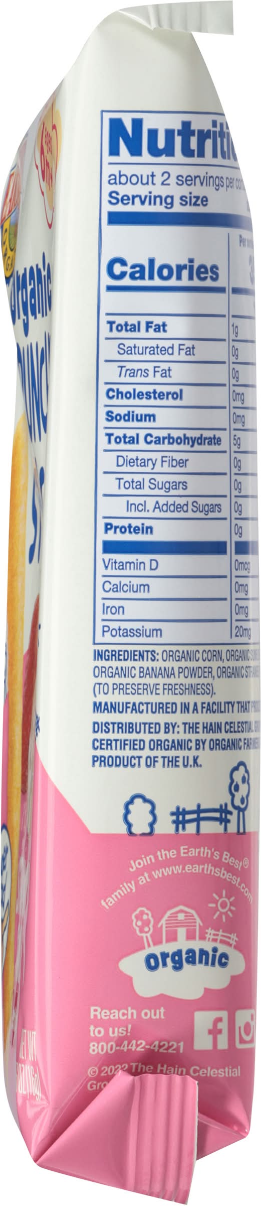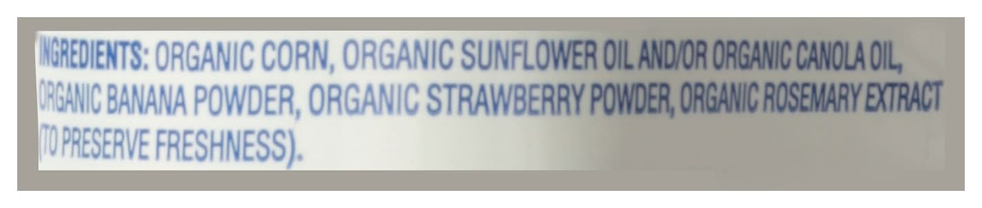 Ingredients: Organic Corn, Organic Sunflower Oil and/or Organic Canola Oil, Organic Banana Powder, Organic Strawberry Powder, Organic Rosemary Extract (to Preserve Freshness) Contains: Corn, Milk, Soybeans, Wheat