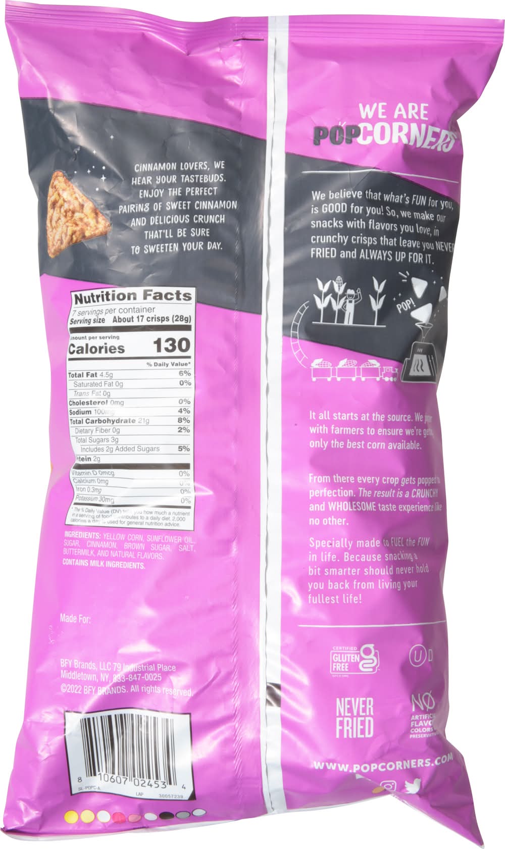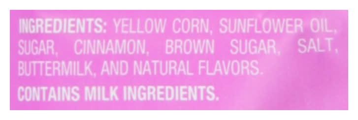 Ingredients: Yellow Corn, Sunflower Oil, Sugar, Cinnamon, Brown Sugar, Salt, Buttermilk, and Natural Flavors Contains: Milk, Corn