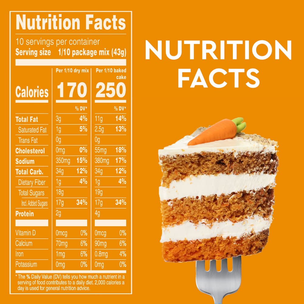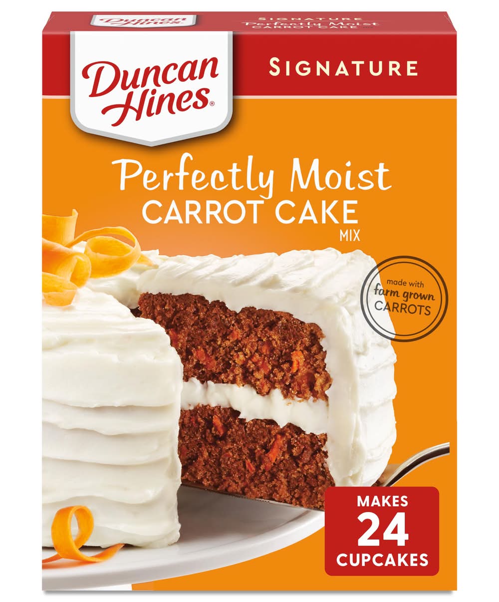 Duncan Hines Signature Perfectly Moist Carrot Cake Mix makes a moist and delicious carrot cake that is sure to become a family favorite. Made with real, farm grown carrots, the smooth and velvety cake batter makes it easy to bake a perfectly moist cake every time. Simply add water, eggs and vegetable oil to the baking mix and stir to combine. Pour into a pan and bake for the recommended time in the instructions. Prepare this carrot cake mix to make a decadent layer cake with cream cheese frosting or add sprinkles for a festive birthday cake. You can also use it as a cupcake mix, or to make fun cake creations like cake pops. This certified Kosher boxed cake mix makes two 8 or 9 inch round cakes, one 13 x 9 inch sheet cake or 24 cupcakes. From birthday cake to single serve desserts, Duncan Hines has you covered when you're ready to bake and create. Bake someone happy! • Conagra Brands, PO Box 3534City:ChicagoState/Province:ILZIP:60654Phone:800-362-9834 • Packaging: Reusable