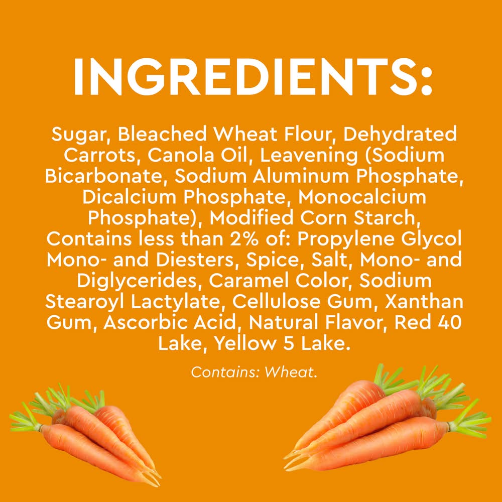 Ingredients: INGREDIENTS: SUGAR, BLEACHED WHEAT FLOUR, DEHYDRATED CARROTS, EMULSIFIED PALM SHORTENING (PALM OIL, PROPYLENE GLYCOL MONO- AND DIESTERS OF FATS AND FATTY ACIDS, MONO- AND DIGLYCERIDES, SODIUM STEAROYL LACTYLATE), LEAVENING (BAKING SODA, SODIUM ALUMINUM PHOSPHATE, DICALCIUM PHOSPHATE, MONOCALCIUM PHOSPHATE MONOHYDRATE), MODIFIED FOOD STARCH, CONTAINS 2% OR LESS OF: SPICES, SALT, CARAMEL COLOR, CELLULOSE GUM, XANTHAN GUM, YELLOW 5, RED 40. MANUFACTURED ON EQUIPMENT THAT ALSO PROCESSESS PEANUTS AND TREE NUTS Contains: Wheat