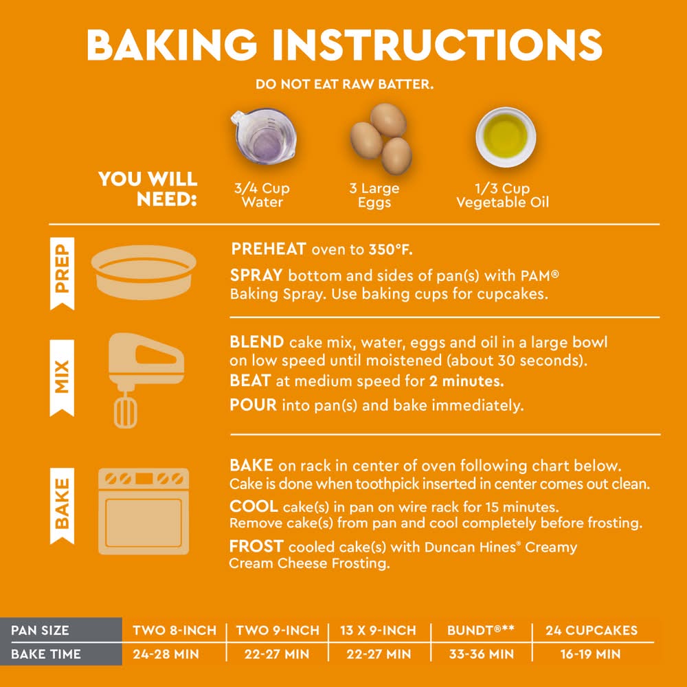 Perfectly moist carrot cake mix: you will need: 3/4 cup water. 3 large eggs. 1/cup vegetable oil. do not eat raw batter. baking instructions: step 1 prep: preheat oven to 350 degrees f for metal and glass pan(s), 325 degrees f for dark or coated pan(s). (add 3-5 minutes to bake time for dark or coated pan(s). cake in done when toothpick inserted in center comes out clean). grease sides and bottom of pan(s) and flour lightly. use baking cups for cupcakes. step 2 mix: blend cake mix, water, oil and eggs in a large bowl at low speed until moistened (about 30 seconds). beat at medium speed for 2 minutes. pour batter in pan(s) and bake immediately. step 3 bake: bake in center of oven following chart below. add 3-5 minutes to bake time for dark or coated pan(s). cake in done when toothpick inserted in center comes out clean. cool cake(s) in pan on wire rack for 15 minutes . remove cake(s) from pan and cool completely before frosting. lower fat recipe: prepare and bake following the directions above except using 3/4 cup water, 1/3 cup unsweetened applesauce and 3 eggs. high altitude (over 3,500 ft): preheat oven to 350 degrees f. stir 3 tablespoons of flour to cake mix, add 1/3 cup oil, 2/3 cup water, and 3 eggs. blend as directed in step 2. bake at 350 degrees f. two 9-inch pans 21-25 min; 13 x 9-inch pan baked 22-27 min; 24 cupcakes 16-20 min. not recommended for 8-inch pans. pan size: two 8-inch; bake time 23-28 min. pan size: two 9-inch; bake time 22-27 min. pan size: 13 x 9-inch; bake time 22-27 min. pan size: bundt (bundt is a registered trademark of northland aluminum products, inc. minneapolis, minnesota); bake time 33-36 min. pan size: 24 cupcakes; bake time 16-19 min.