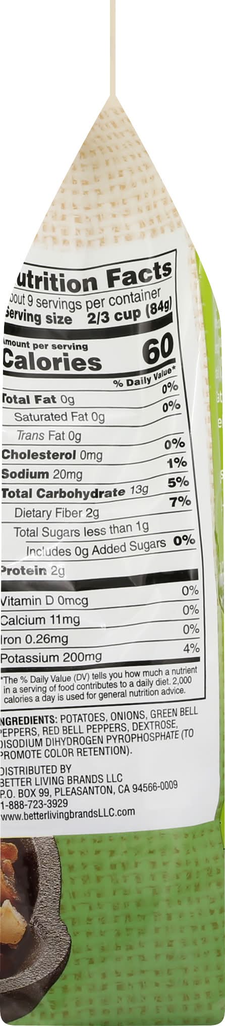 Ingredients: Potatoes, Onions, Green Bell Peppers, Red Bell Peppers, Dextrose, Disodium Dihydrogen Pyrophosphate (to Promote Color Retention).