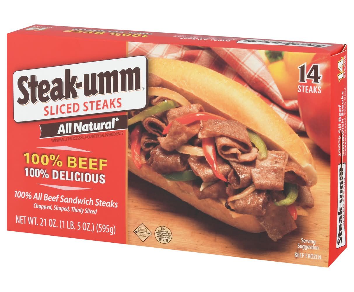 100% All beef sandwich steaks. Chopped, shaped, thinly sliced. All natural (Minimally processed, no artificial ingredients). 100% Beef. 100% Delicious. Steak-umm Sliced Steaks are delicious, easy to prepare and ready in just two minutes. They’re perfect for any meal or snack and are 100% beef, with no artificial anything. Breakfast. Snacks. Meals. Steak-umm Company, LLC, Shillington,PA,19607-0350