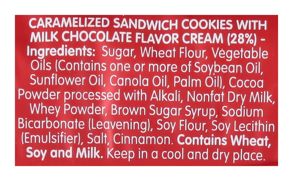 Ingredients: Sugar, Wheat Flour, Vegetable Oils (Contains One or More of Soybean Oil, Sunflower Oil, Canola Oil, Palm Oil), Cocoa Powder Processed with Alkali, Nonfat Dry Milk, Whey Powder, Brown Sugar Syrup, Sodium Bicarbonate (Leavening), Soy Flour, Soy Lecithin (Emulsifier), Salt, Cinnamon Contains: Wheat, Soybeans, Milk