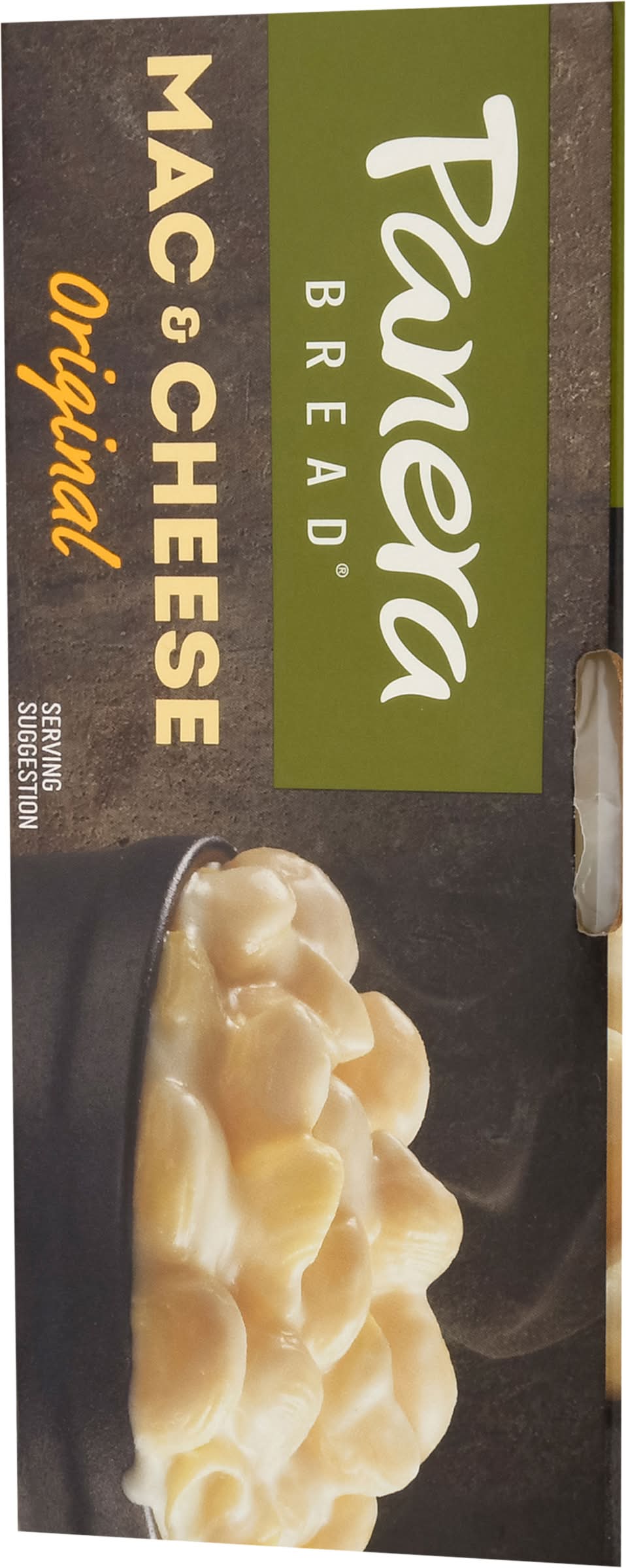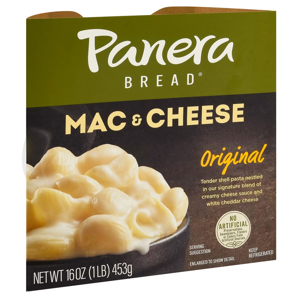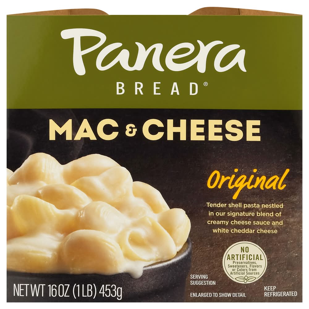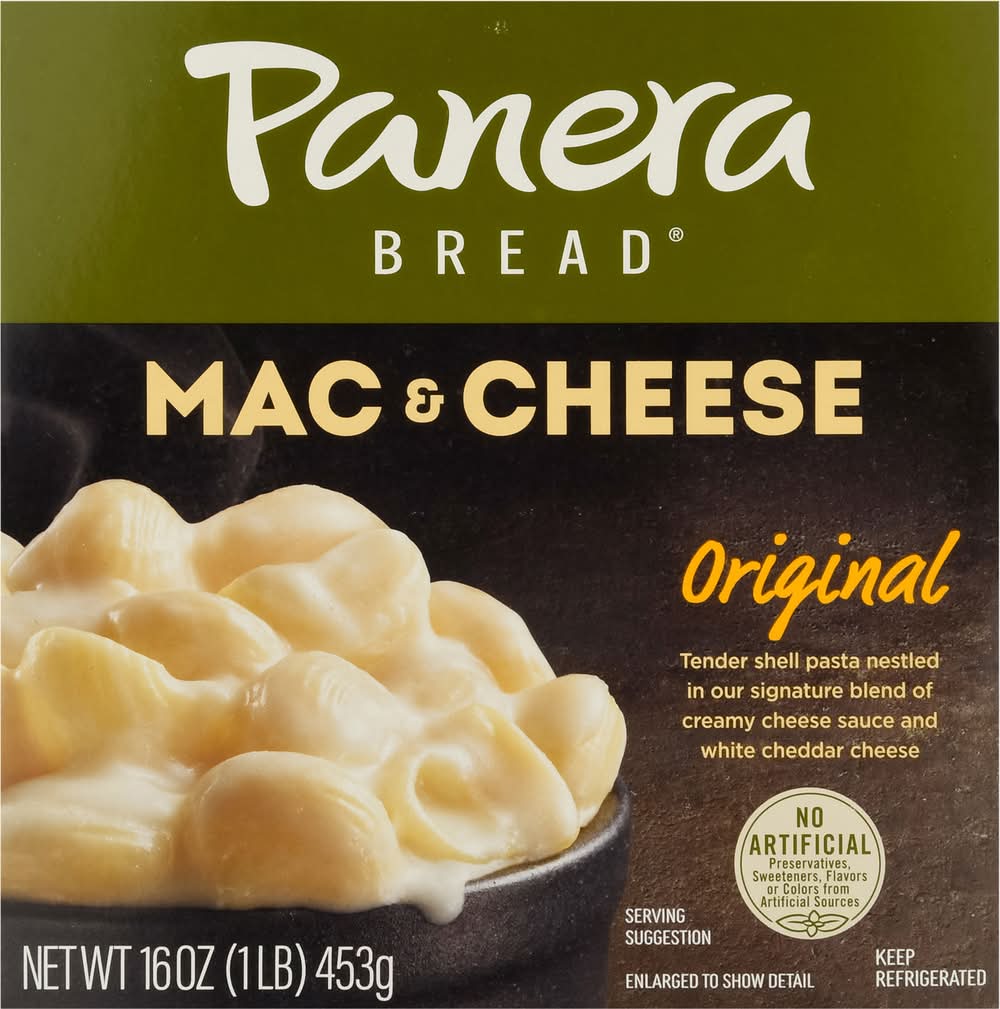 Panera Bread Mac & Cheese is presented in a Tender shell pasta nestled in our signature blend of creamy cheese sauce and white cheddar cheese. No artificial preservatives, sweeteners, flavors or colors from artificial sources. • Panera Bread, St. Louis, MO, 63127 • Packaging: Reusable