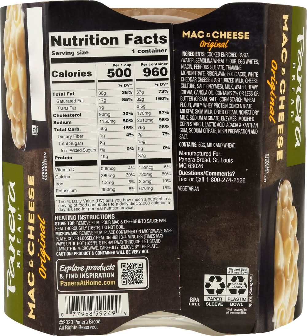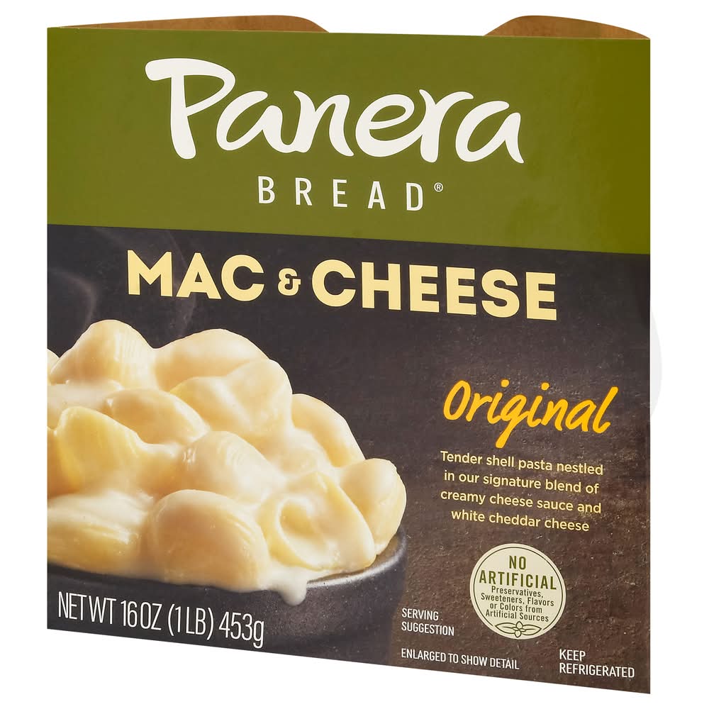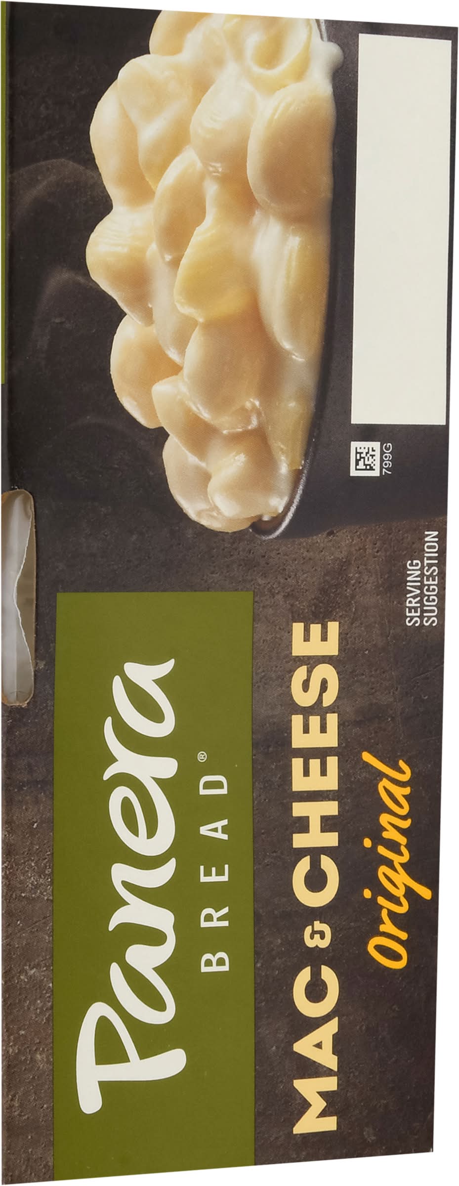 Panera Bread Mac & Cheese is presented in a Tender shell pasta nestled in our signature blend of creamy cheese sauce and white cheddar cheese. No artificial preservatives, sweeteners, flavors or colors from artificial sources. • Panera Bread, St. Louis, MO, 63127 • Packaging: Reusable