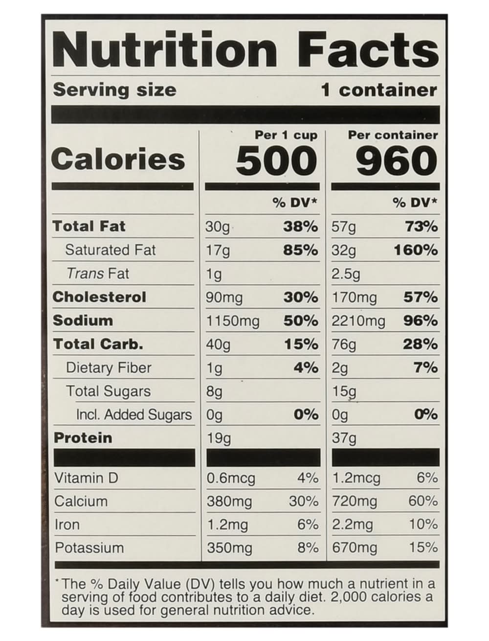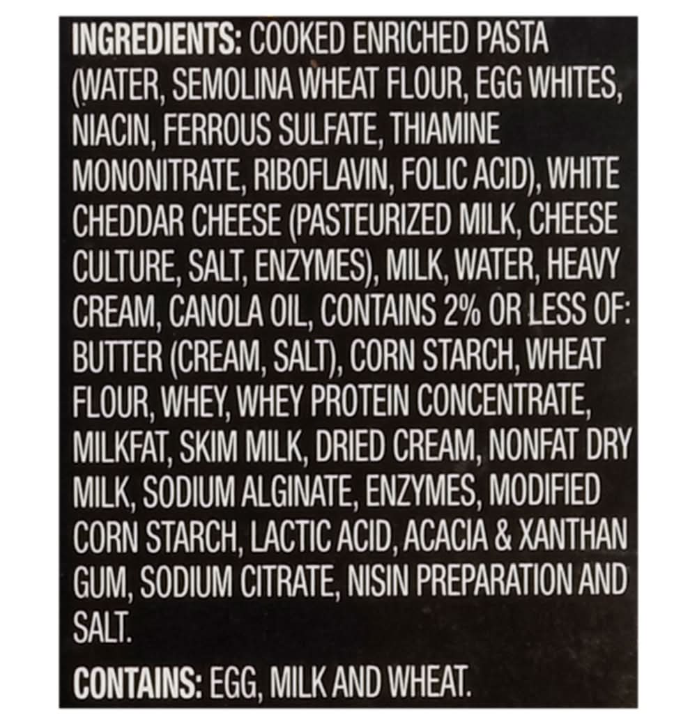 Ingredients: Cooked Enriched Pasta (Water, Semolina Wheat Flour, Egg Whites, Niacin, Ferrous Sulfate, Thiamine Mononitrate, Riboflavin, Folic Acid), White Cheddar Cheese (Pasteurized Milk, Cheese Culture, Salt, Enzymes), Milk, Water, Heavy Cream, Canola Oil, Contains 2% or Less of: Butter (Cream, Salt), Corn Starch, Wheat Flour, Whey, Whey Protein Concentrate, Milkfat, Skim Milk, Dried Cream, Nonfat Dry Milk, Sodium Alginate, Enzymes, Modified Corn Starch, Lactic Acid, Acacia & Xanthan Gum, Sodium Citrate, Nisin Preparation and Salt Contains: Eggs, Wheat, Milk